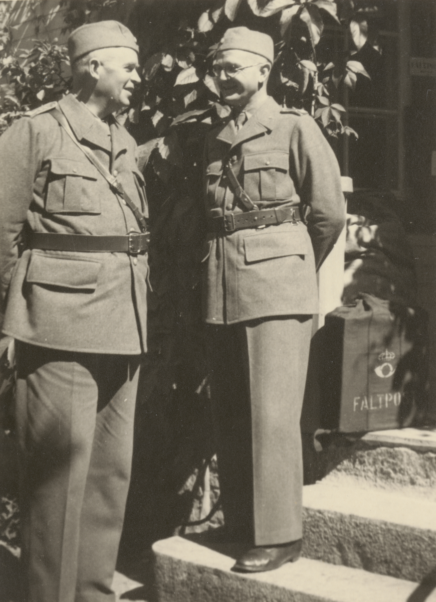 Två officerare samtalar på trappa med fältpostlåda, uniform m/1939.