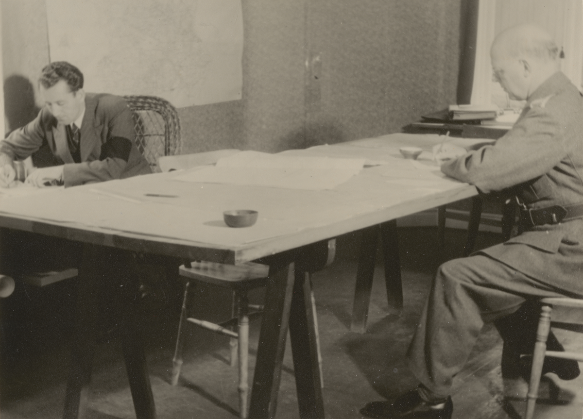 Civilist och militär vid ett vinkelbyggt bord, uniform m/1939.