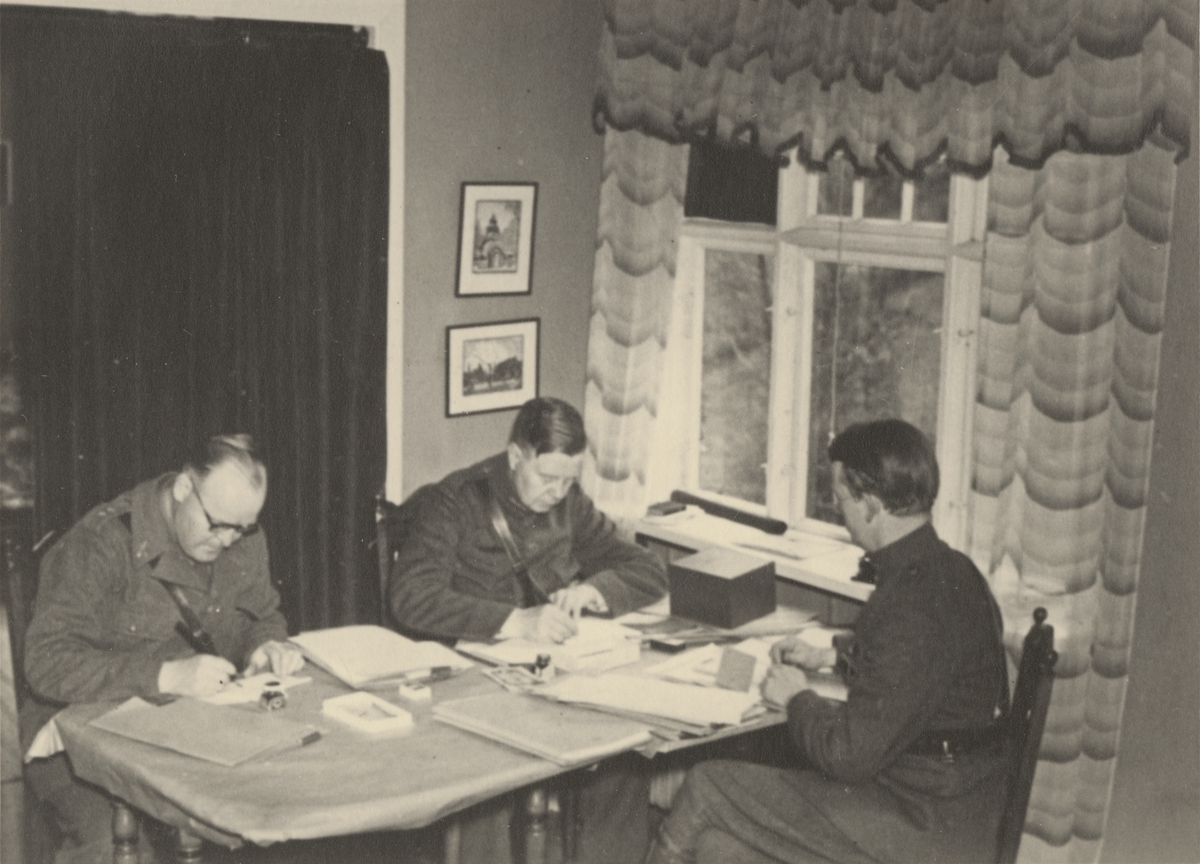 Tre män, varav en kavallerist, arbetar vid bord, uniform m/1939.