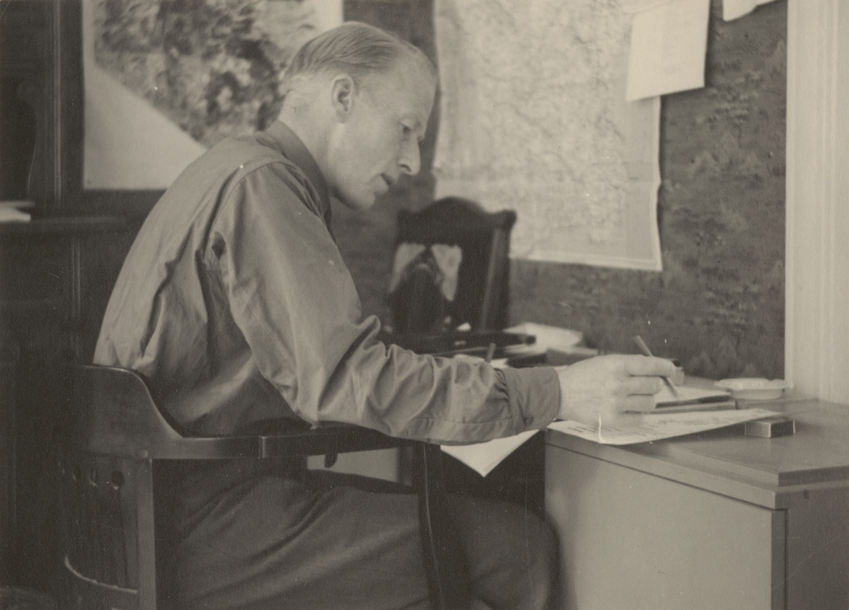 Man i skjortärmar arbetar vid skrivbord, uniform m/1939.