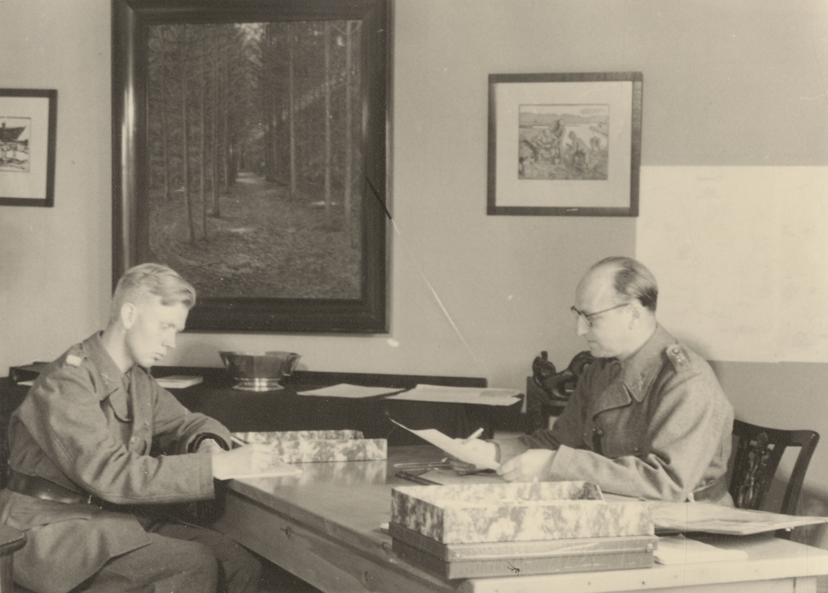 Infanterist och en man ur trängen sitter vid skrivbord, expeditionstjänst, uniform m/1939.