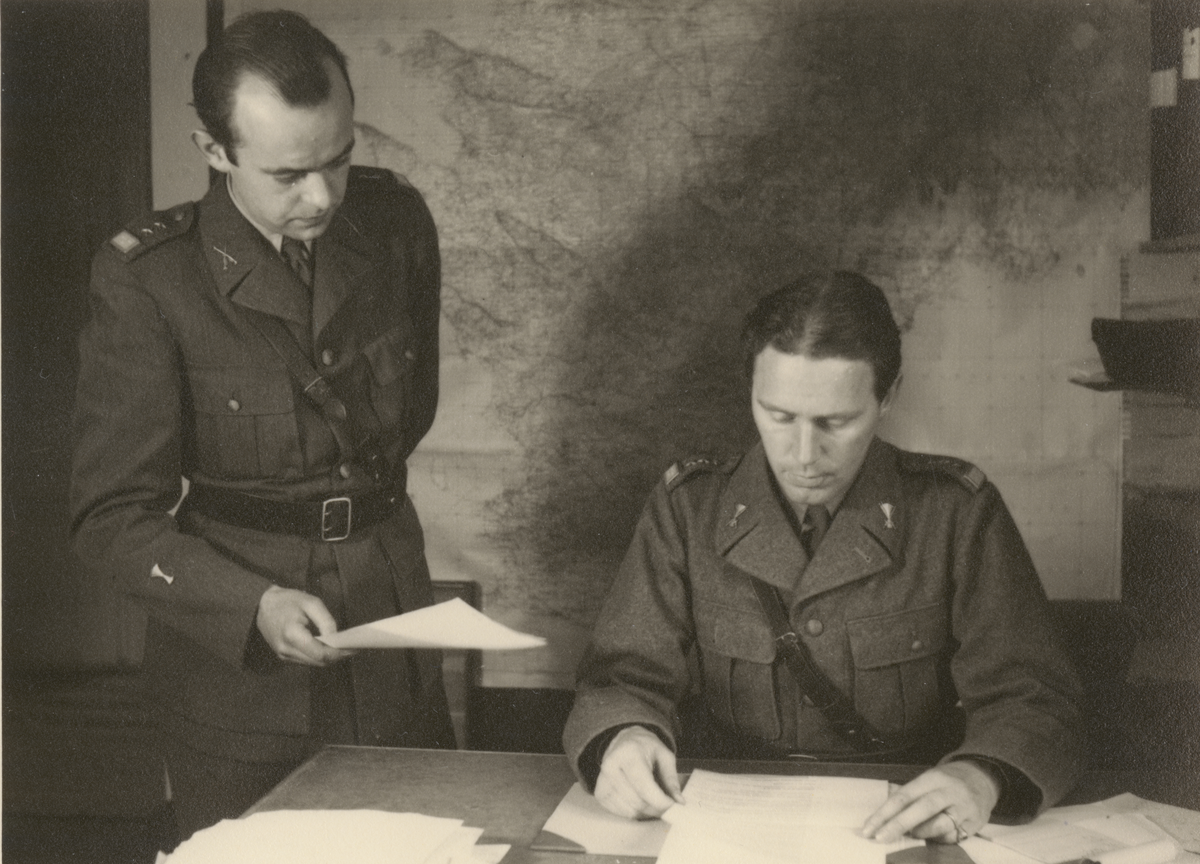 Kavallerist läser vid skrivbord, en infanterilöjtnant räcker honom ett papper, expeditionstjänst, uniform m/1939.