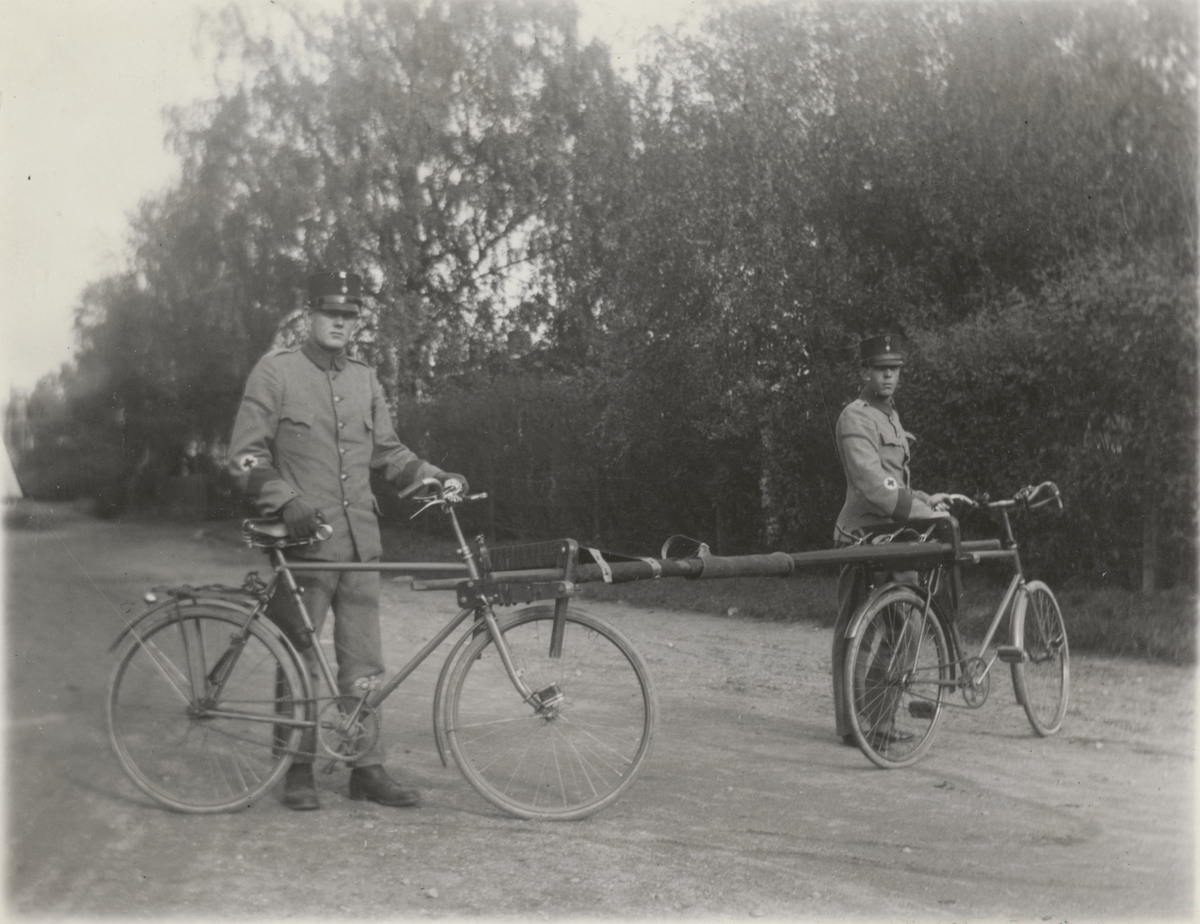 Titel: Två sjukvårdare med bår mellan cyklar vid landsväg. Uniform m/1910.