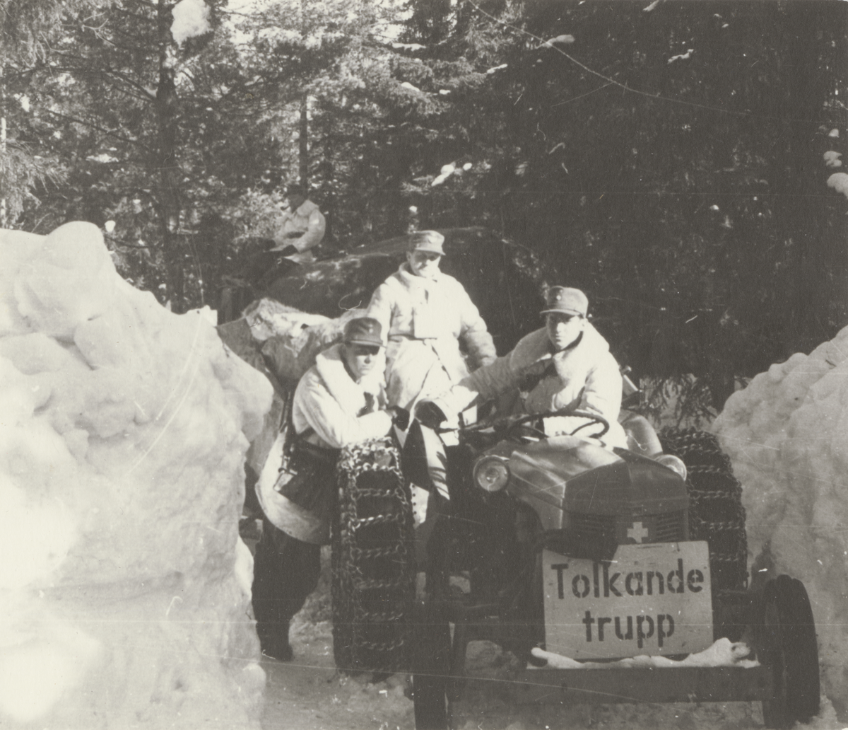 Titel: Tre män på en traktor med snökedjor.