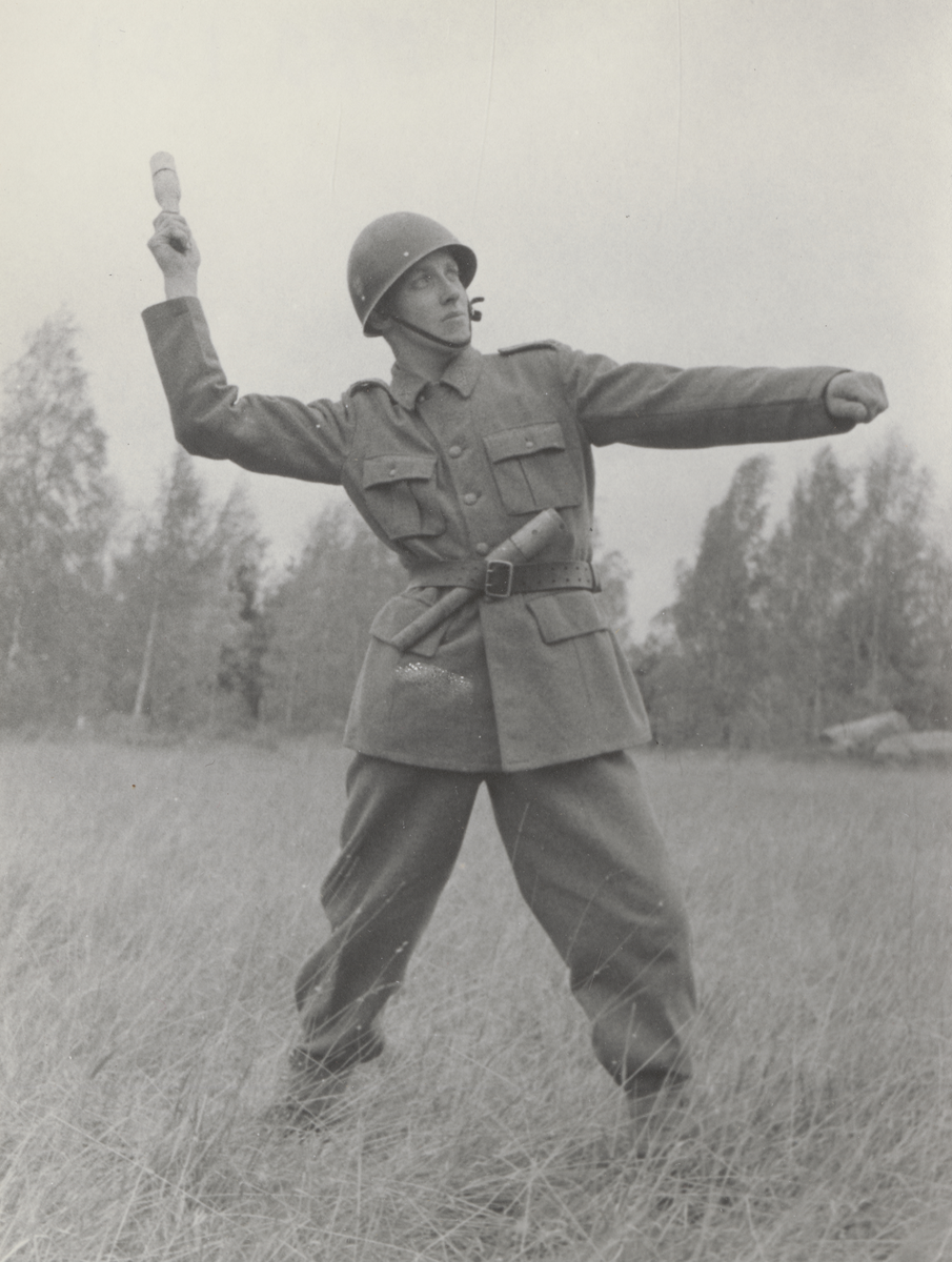Titel: Soldat i uniform m/1939 kastar spränghandgranat m/1918.