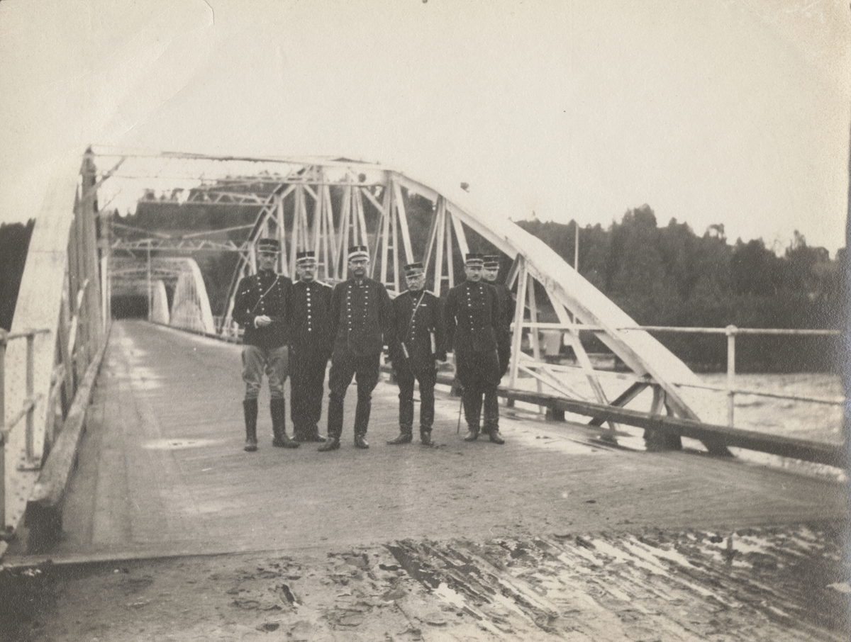 Titel: Sex män poserar på stålbro över älv.