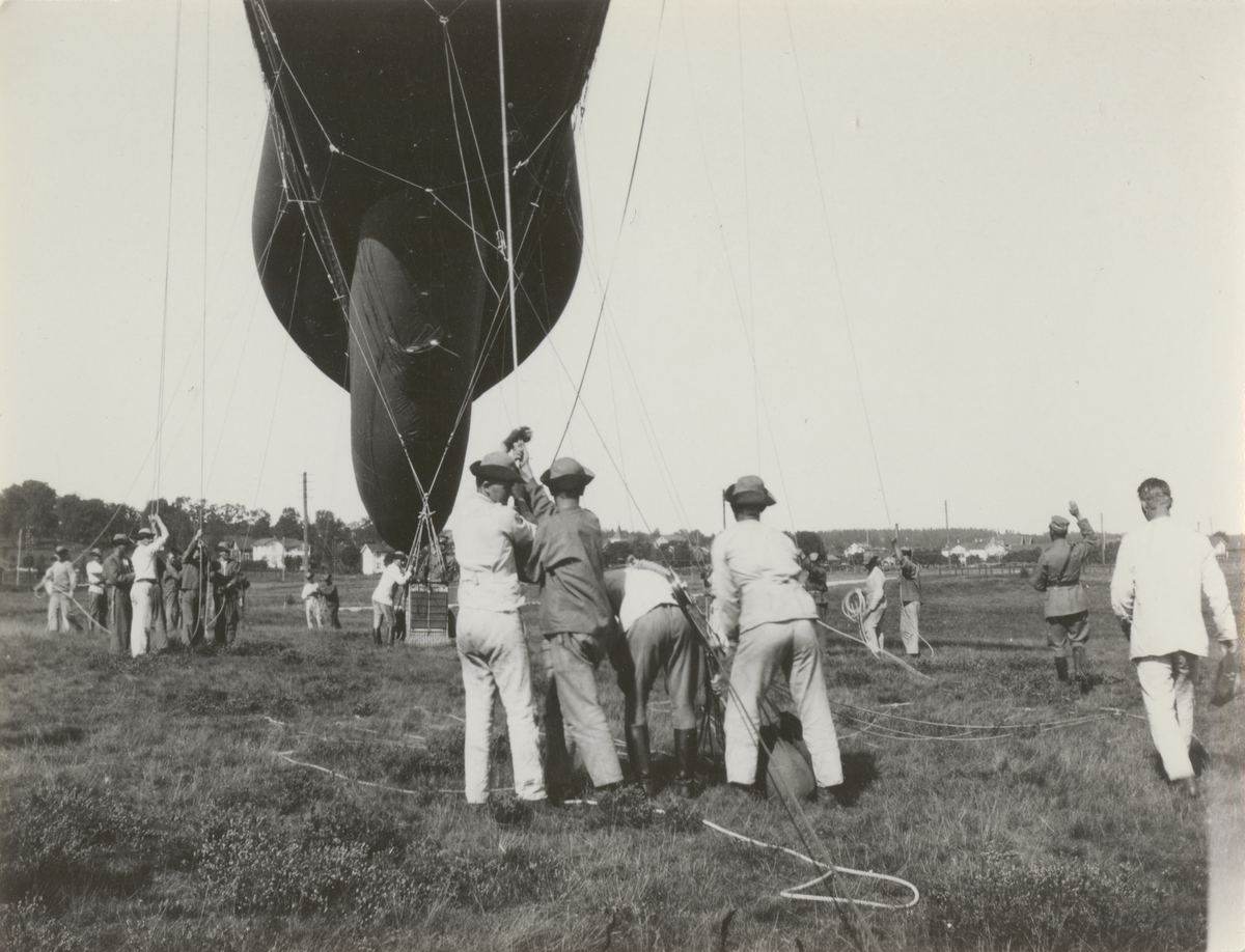 Ballongtjänst, en avlång ballong med korg och fenor hålls nere med linor på stort fält.