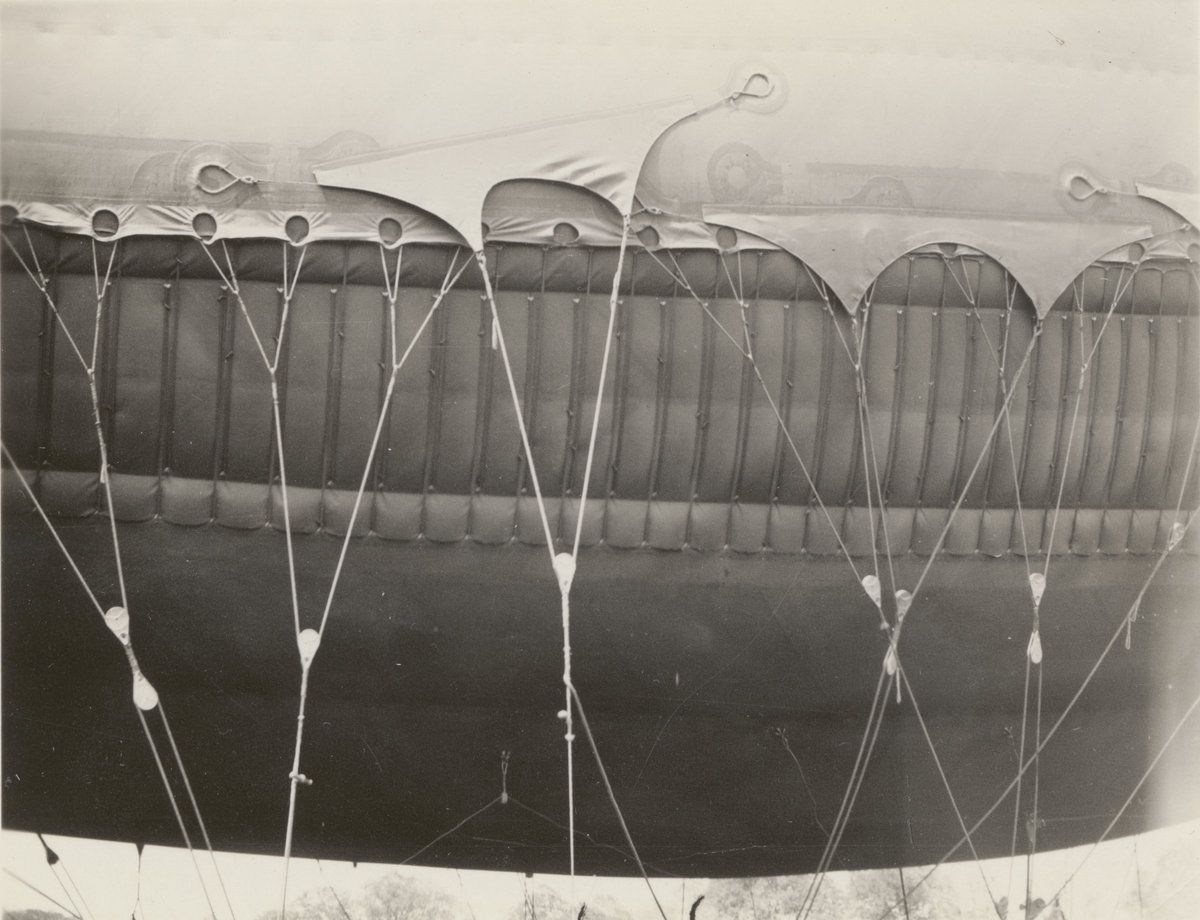Ballongtjänst, närbild på ballongdukens mellersta del med infästning av ankringslinorna.