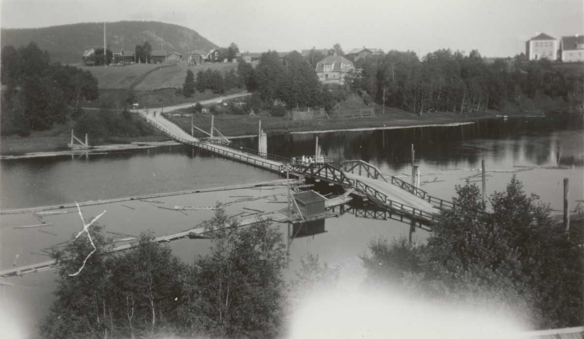 Titel: Rommehed bro över älv med timmer som flyter i leden.