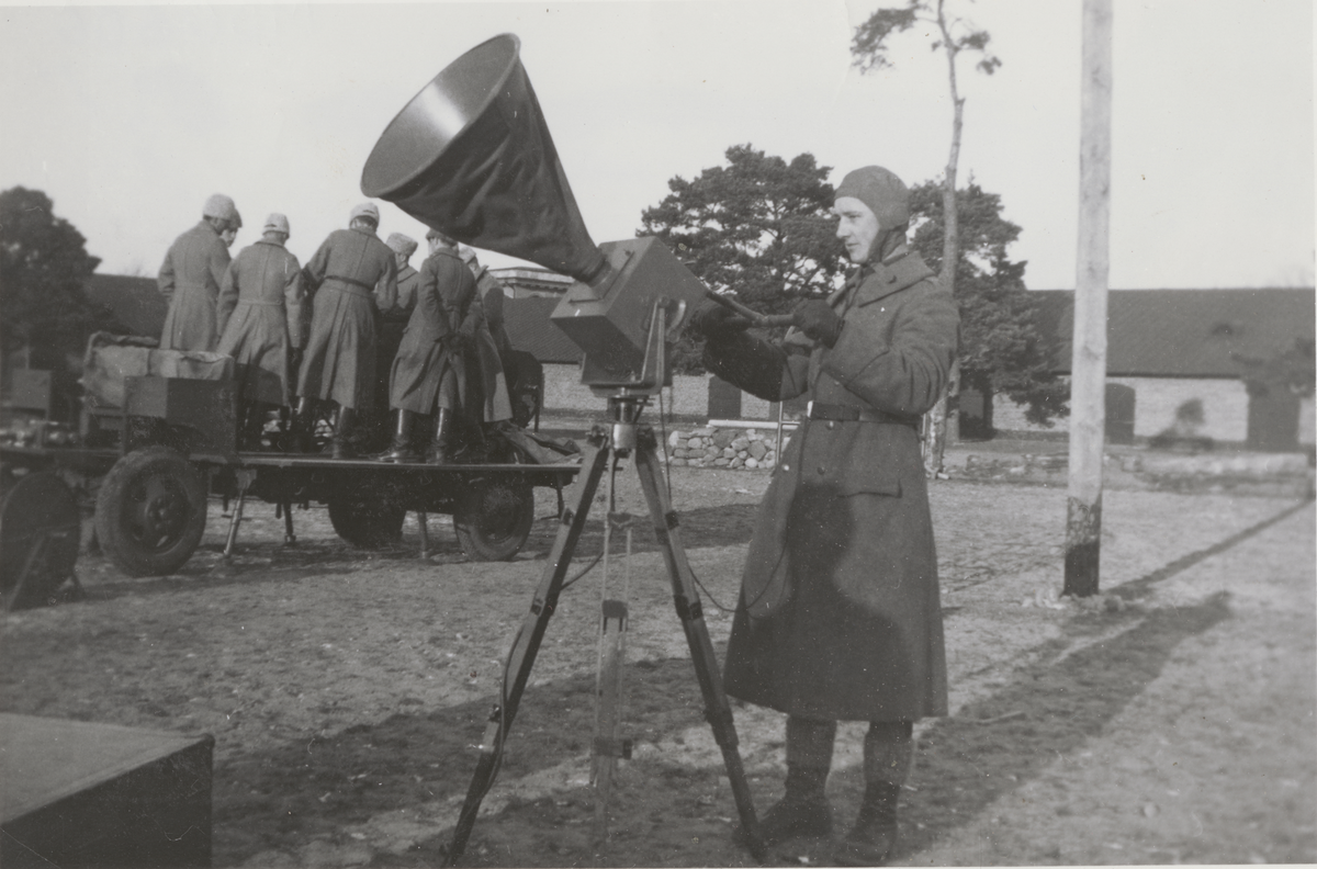 Man med hörlurar och luva hanterar målspaningsaggregat m/1936 Tepaz, vagn med avståndsapparater i bakgrunden.