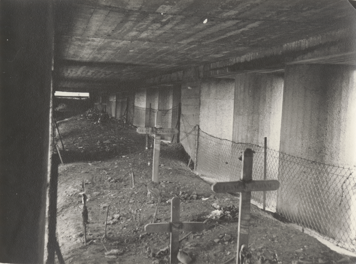 Titel: Betonghall med gravkors i sönderskjuten fästning.