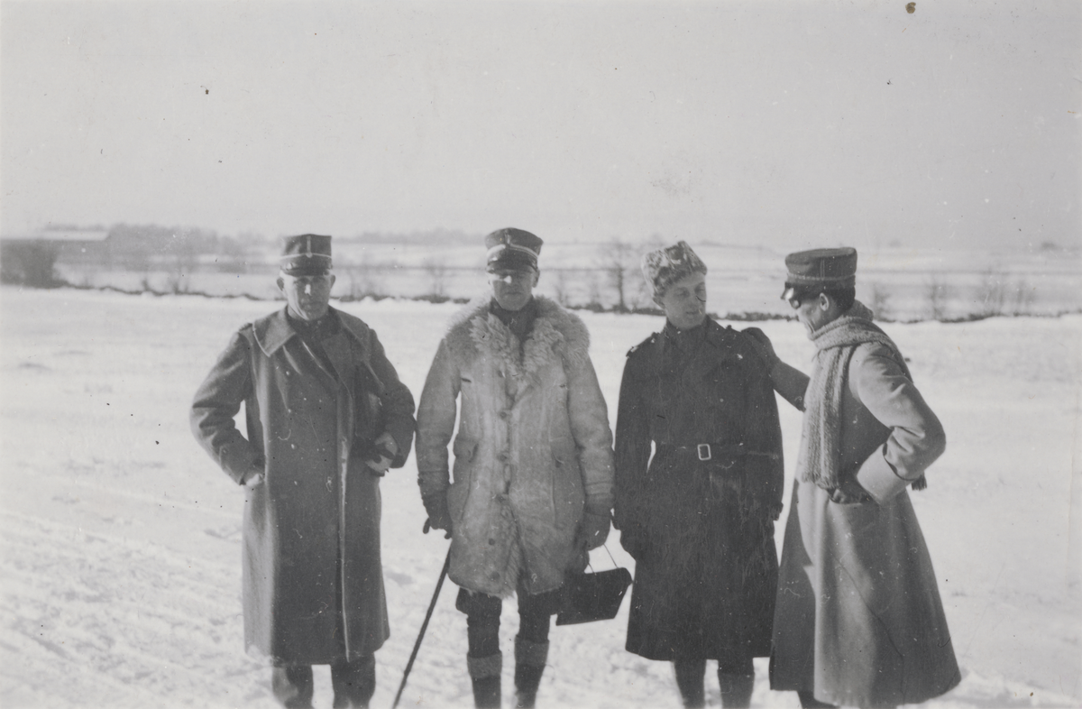 Fyra män poserar på ett snötäckt fält, troligen i Norrland. Foto ur anonym serie från beredskapen.