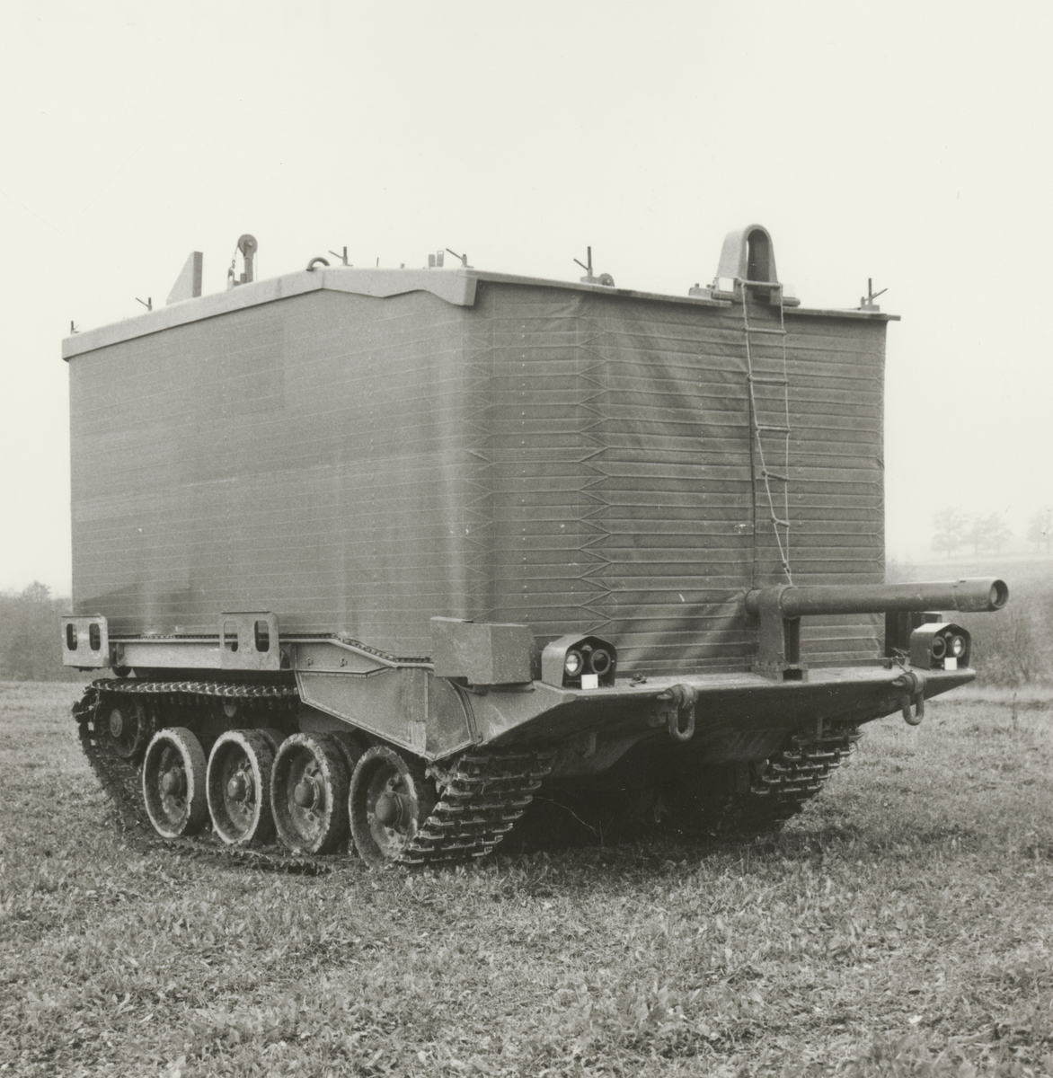 Titel: Stridsvagn 103 med uppfälld flytkrage på fält.