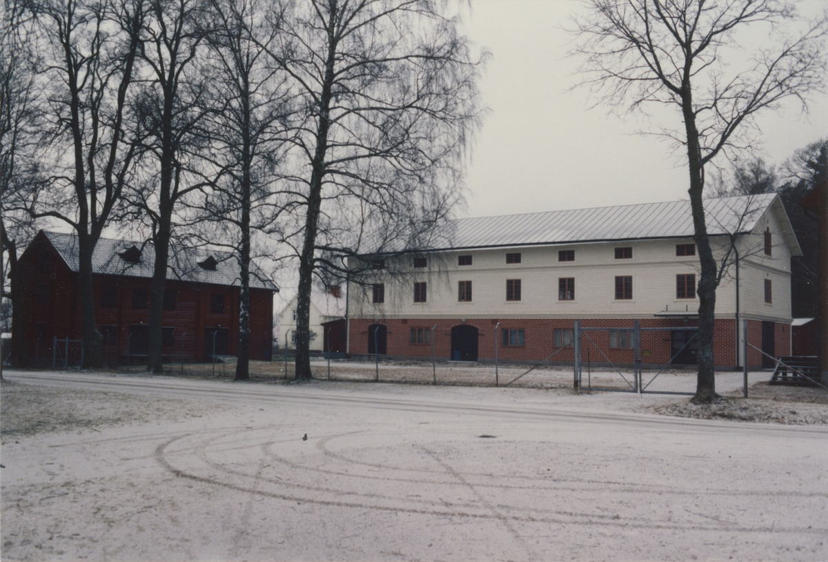 Malmahed, röd byggnad bakom ett ståltrådsstaket, intill en vit byggnad med bottenvåning av rött tegel.