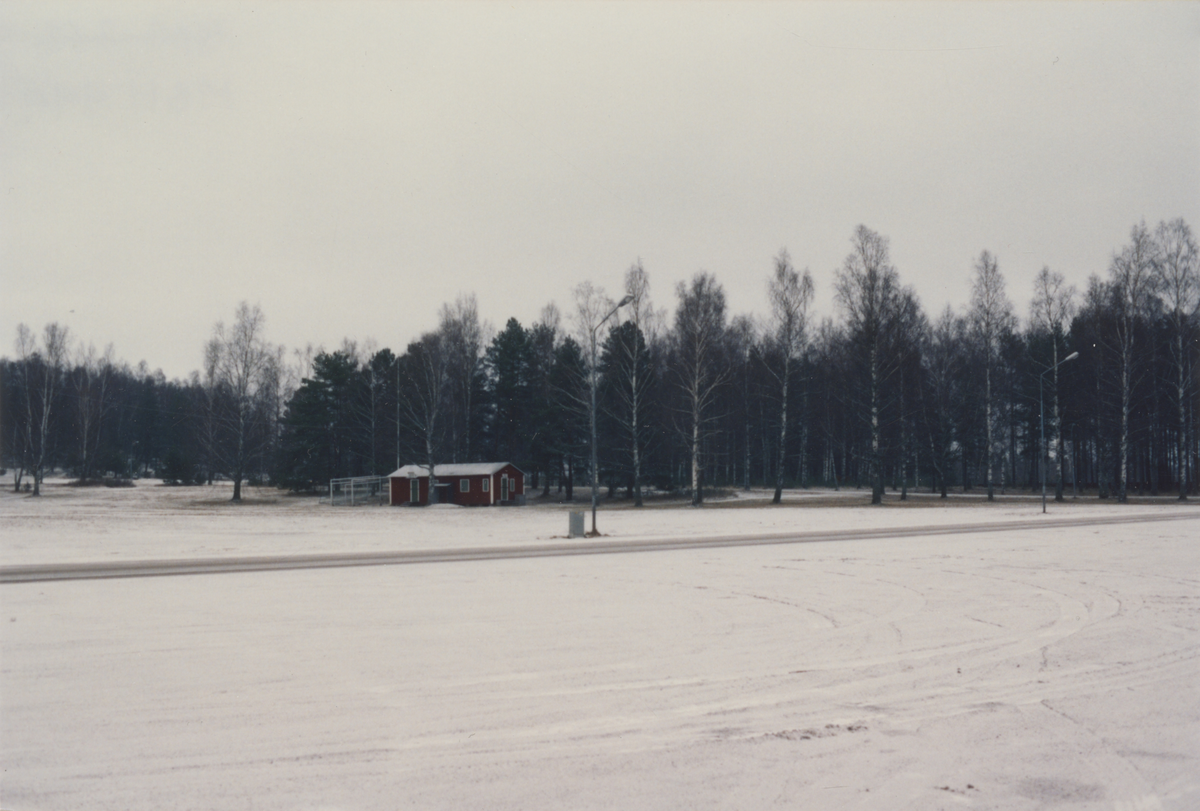 Malmahed, snötäckt fält med en väg, gatlyktor samt en mindre barack.