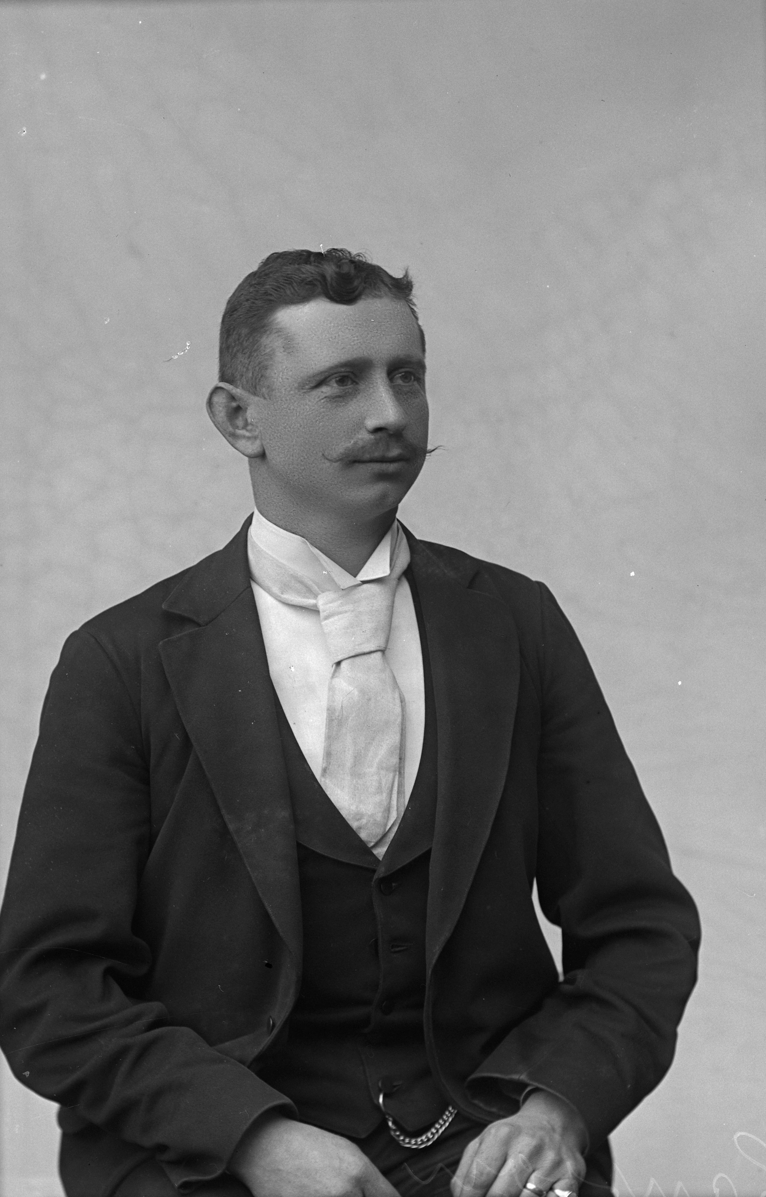 Beskrivning: Porträtt i halvfigur av F. Hansen.