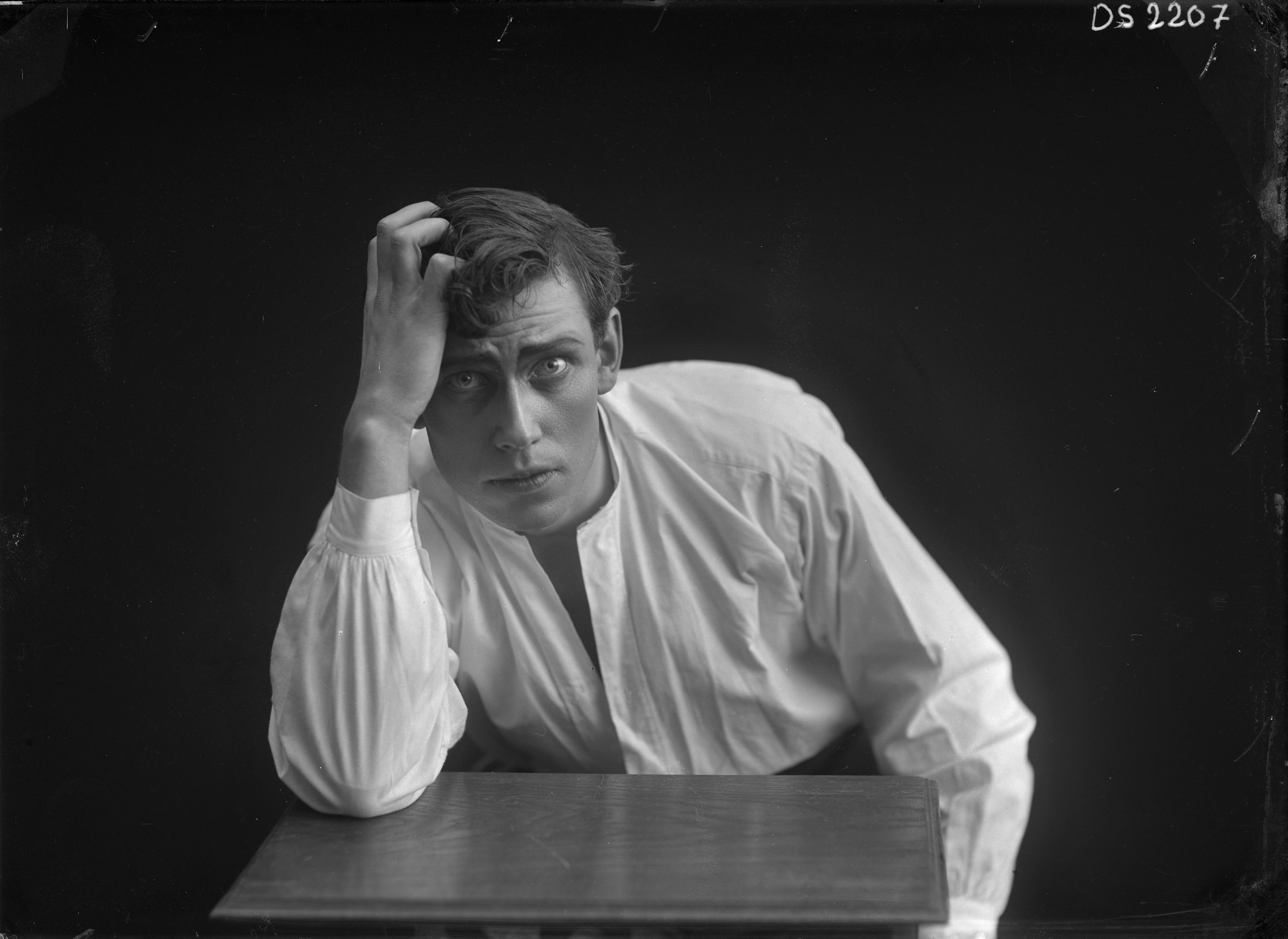 Porträtt i halvfigur av skådespelare Lindgren, sittande vid bord.