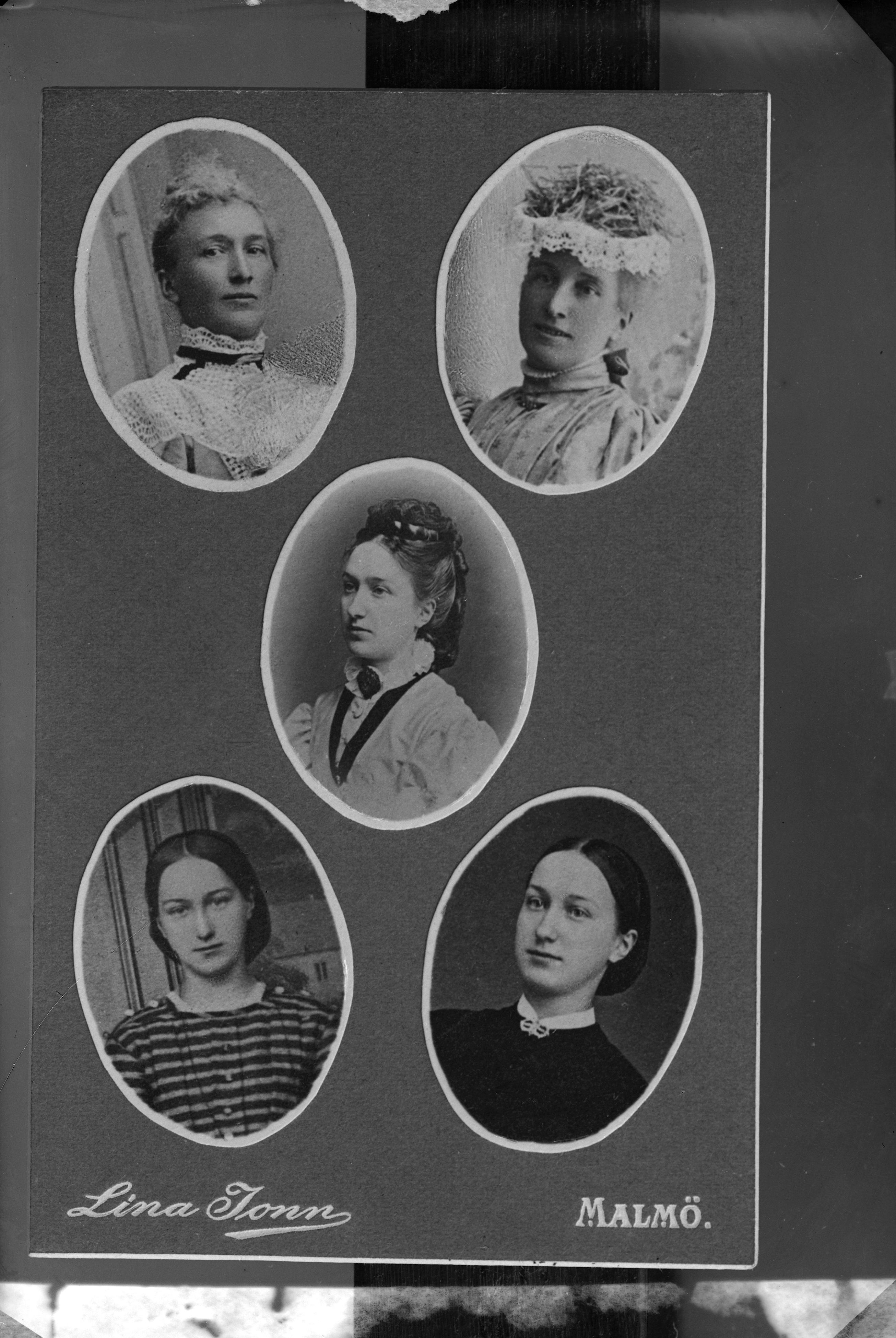 Porträtt i halvfigur av fem oidentifierade kvinnor, ovala porträtt i fotokollage. Reprofotografi beställt av fru Isberg Blomgren. Originalfotografier tagna av Lina Jonn (1861-1896).