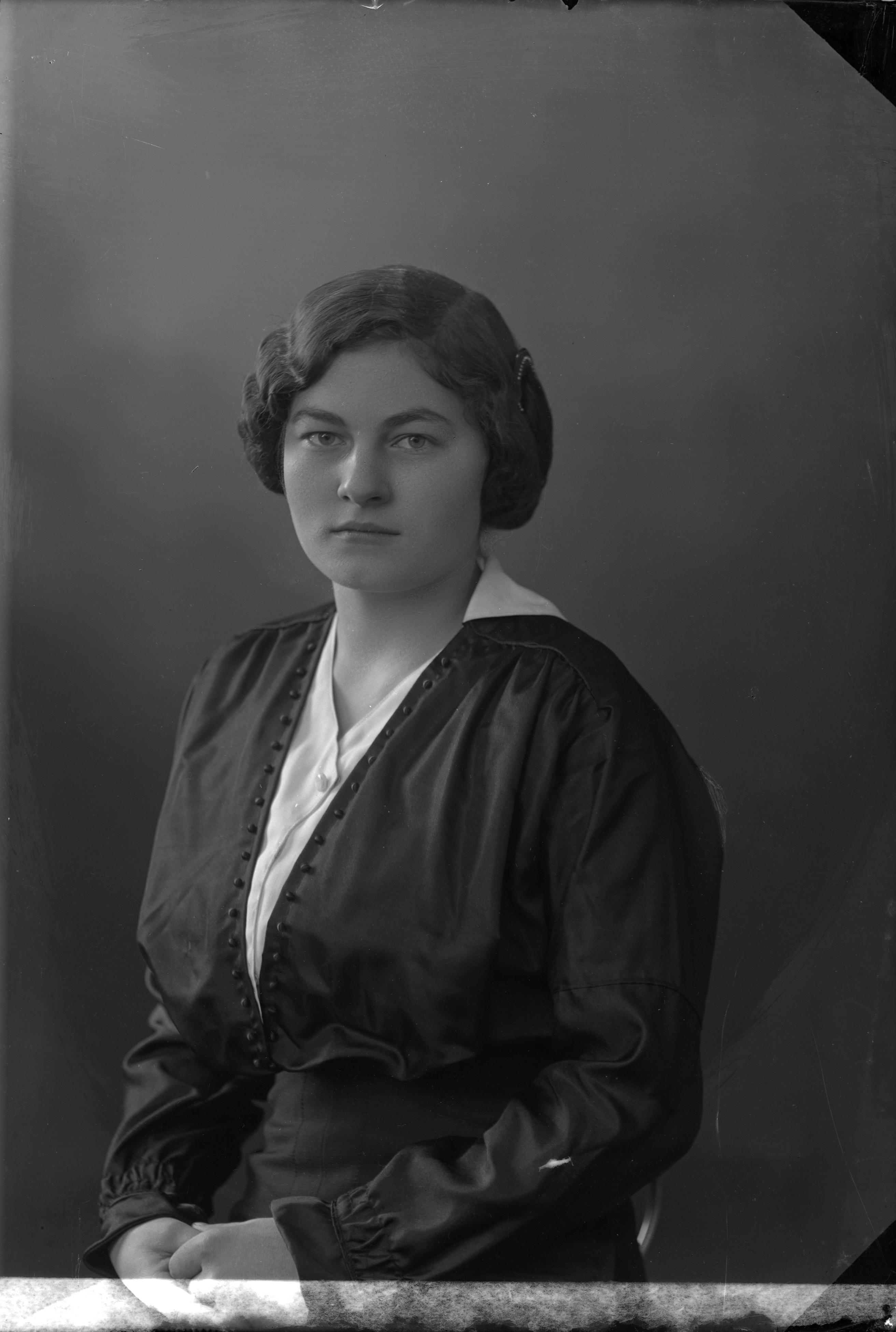 Beskrivning: Porträtt i halvfigur av Hildur Nilsson.