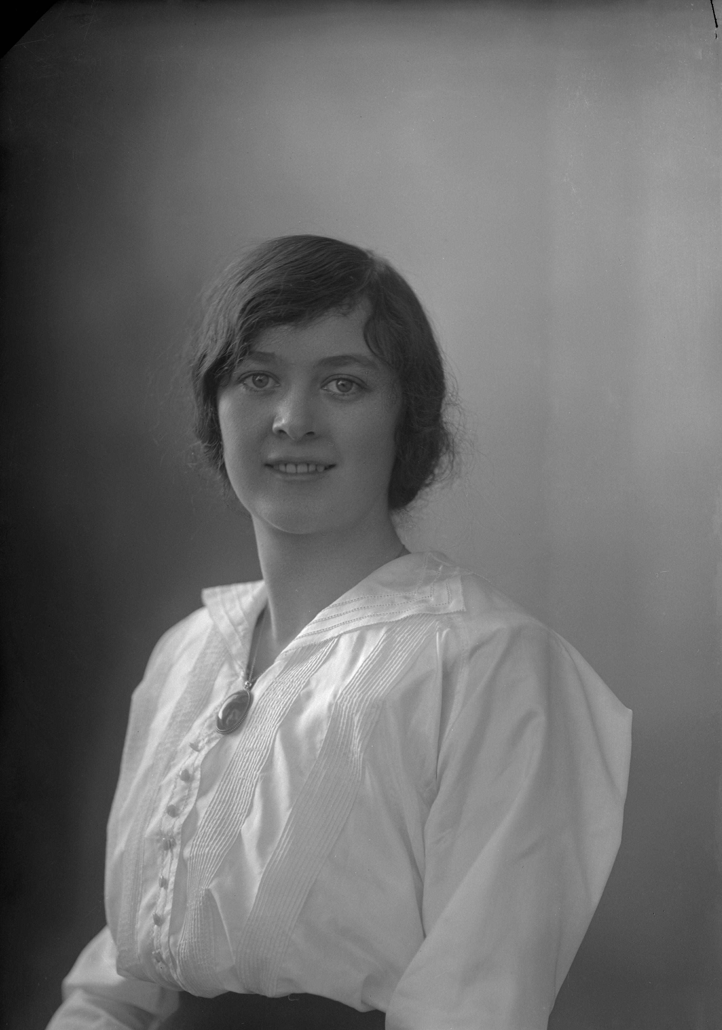 Beskrivning: Porträtt i halvfigur av Gärda Karlsson.
