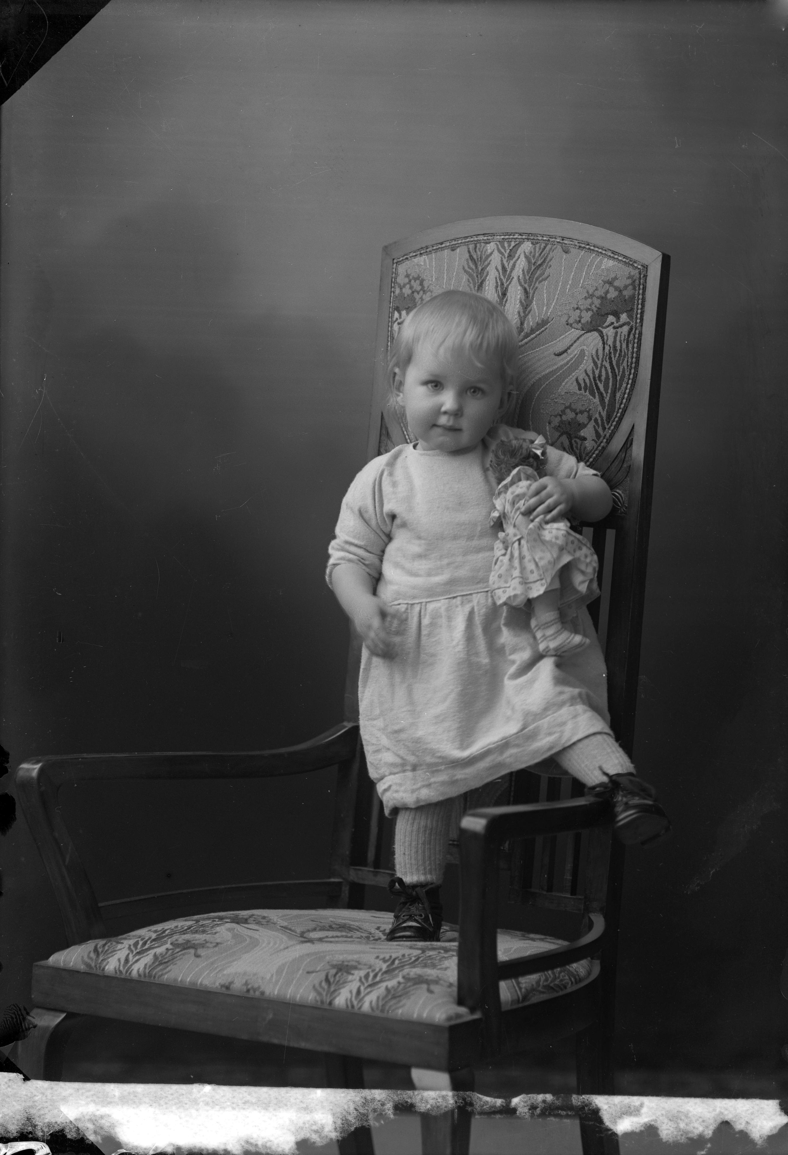 Porträtt i helfigue av fru Lunds dotter, stående på stol.