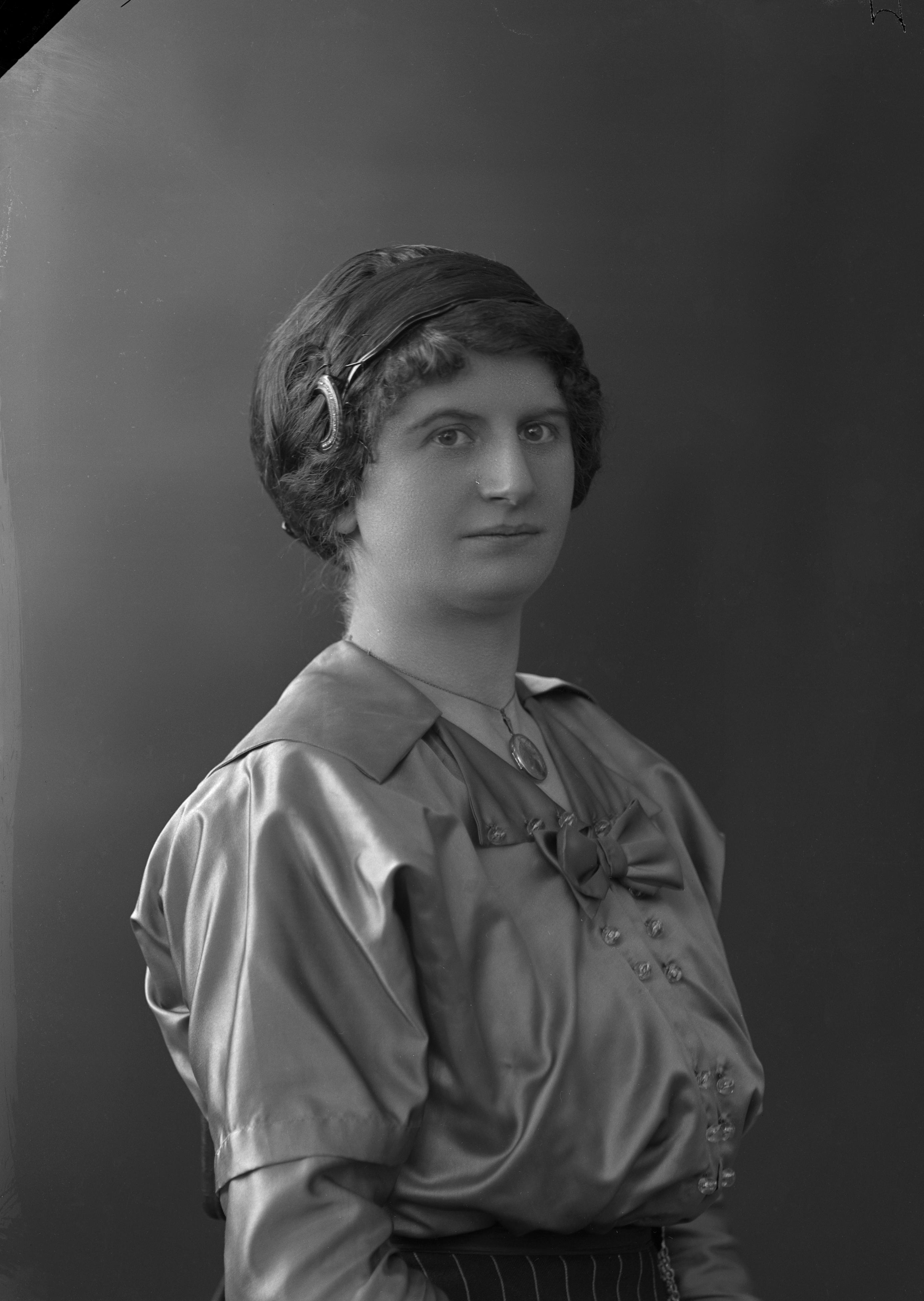 Beskrivning: Porträtt i halvfigur av Anna Pettersson.