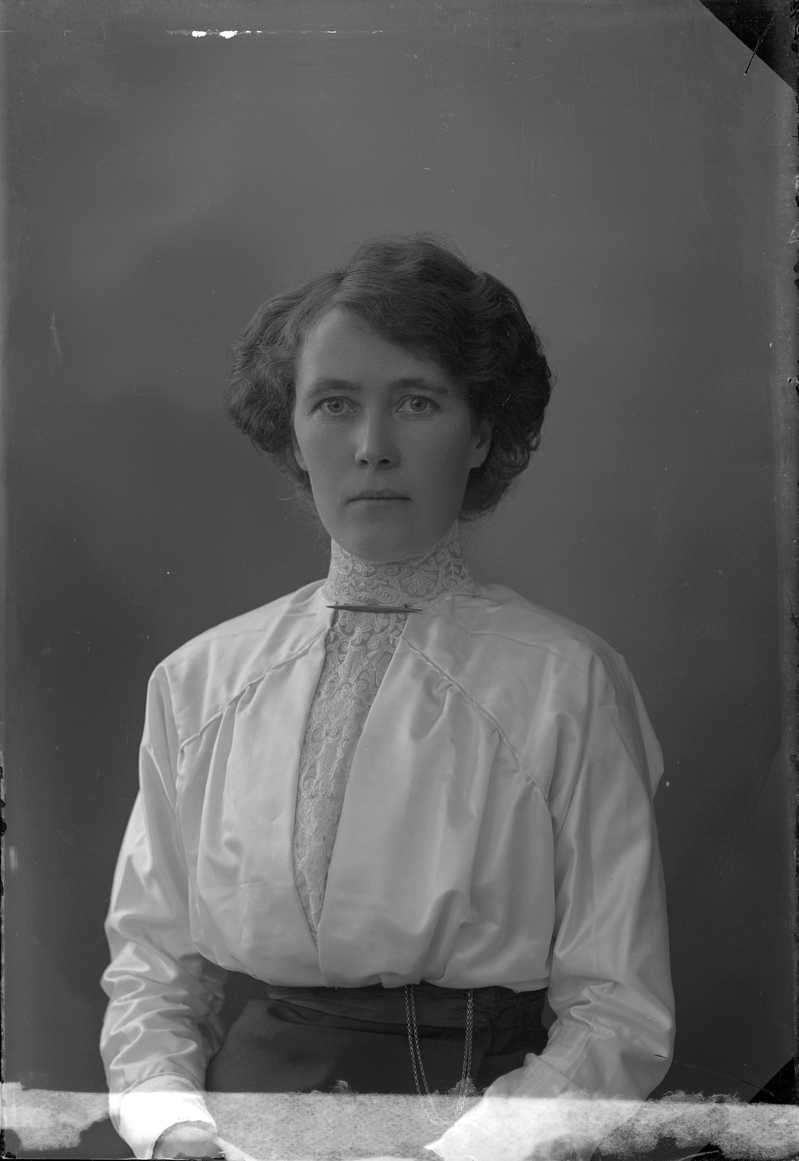 Beskrivning: Porträtt i halvfigur av Hilda Hansson.
