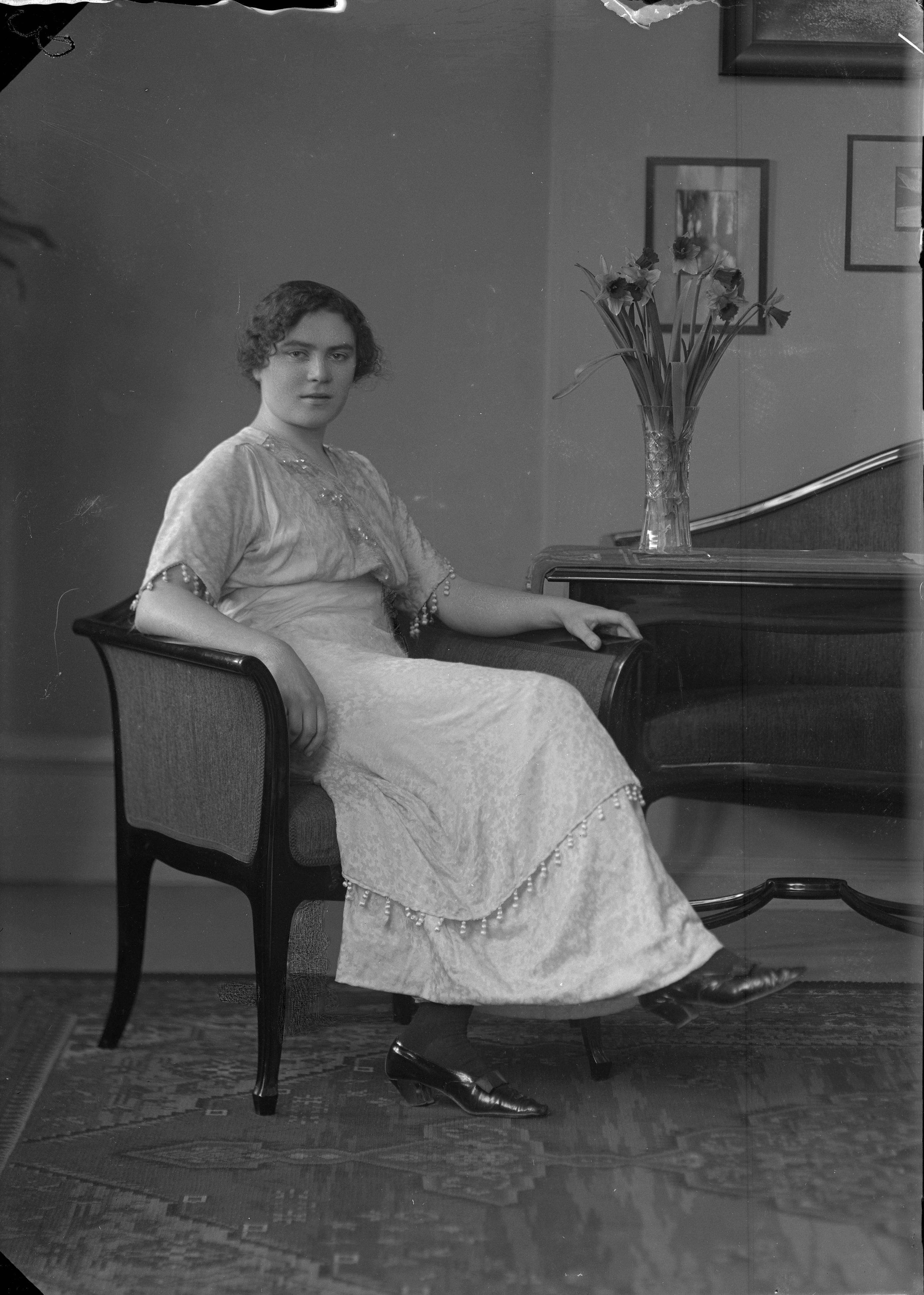 Porträtt i helfigur av Stina Larsson i rumsinteriör, sittande i stol.
