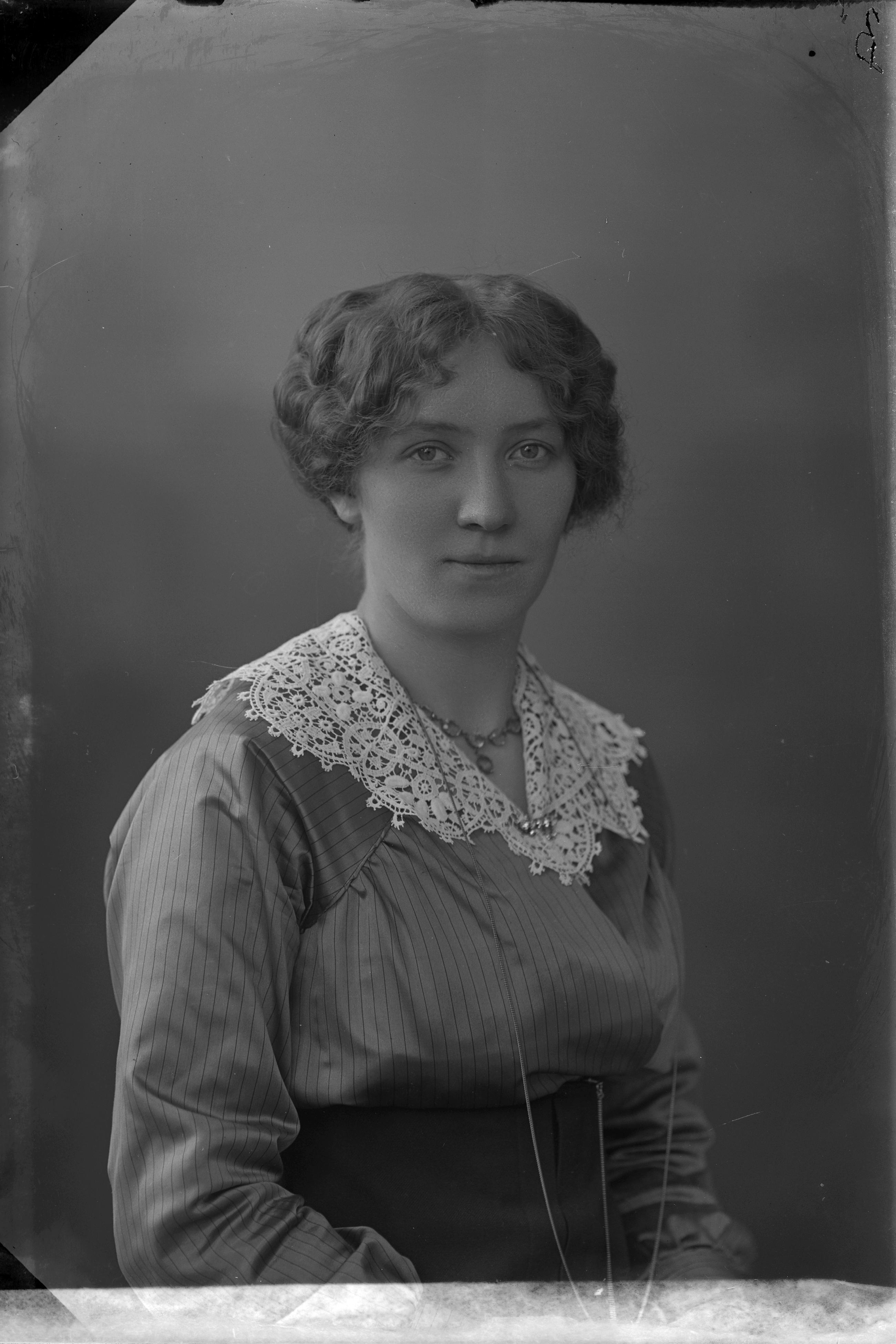 Beskrivning: Porträtt i halvfigur av Hilda Andersson.