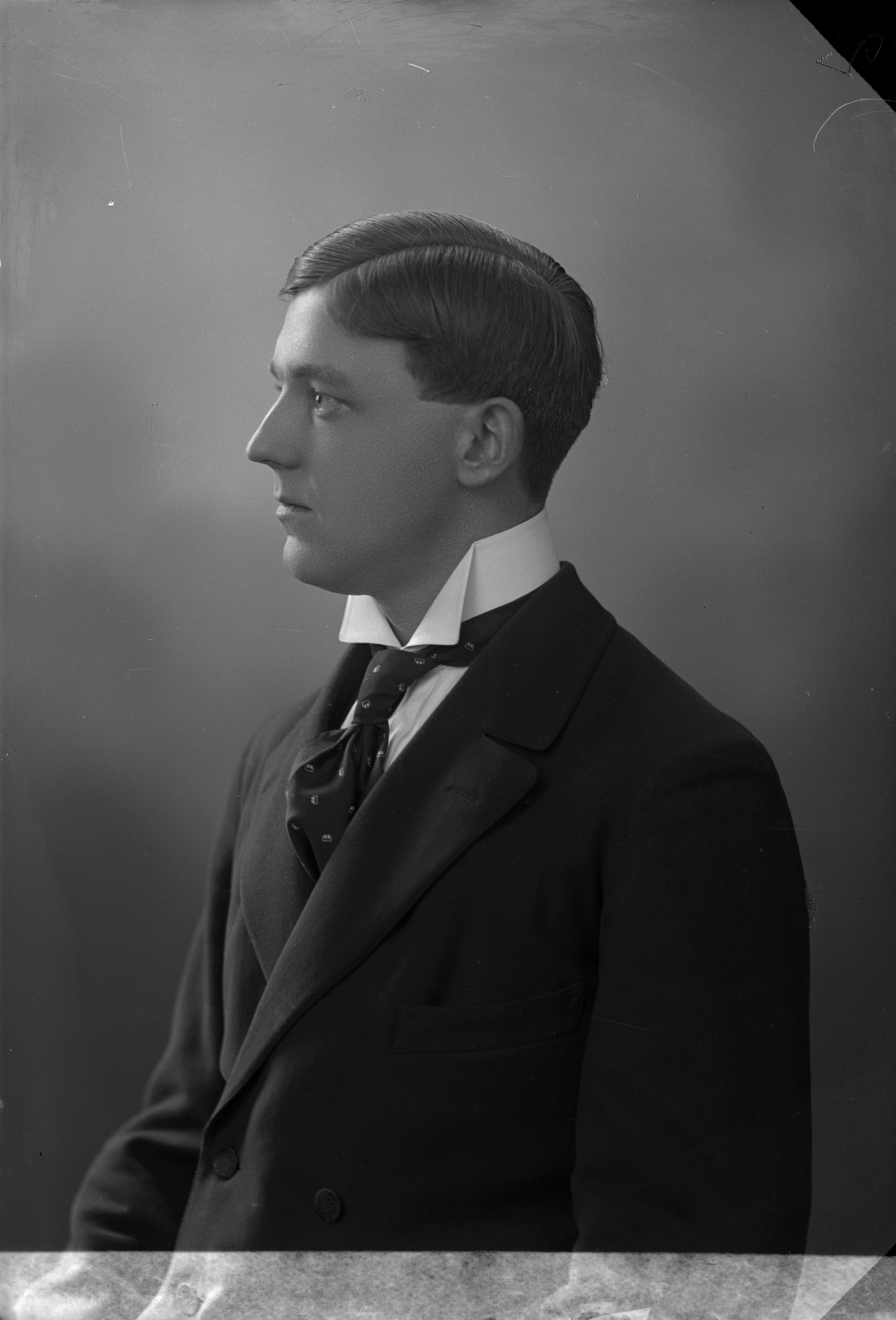 Porträtt i halvfigur av Gustaf Persson, ansikte i profil.