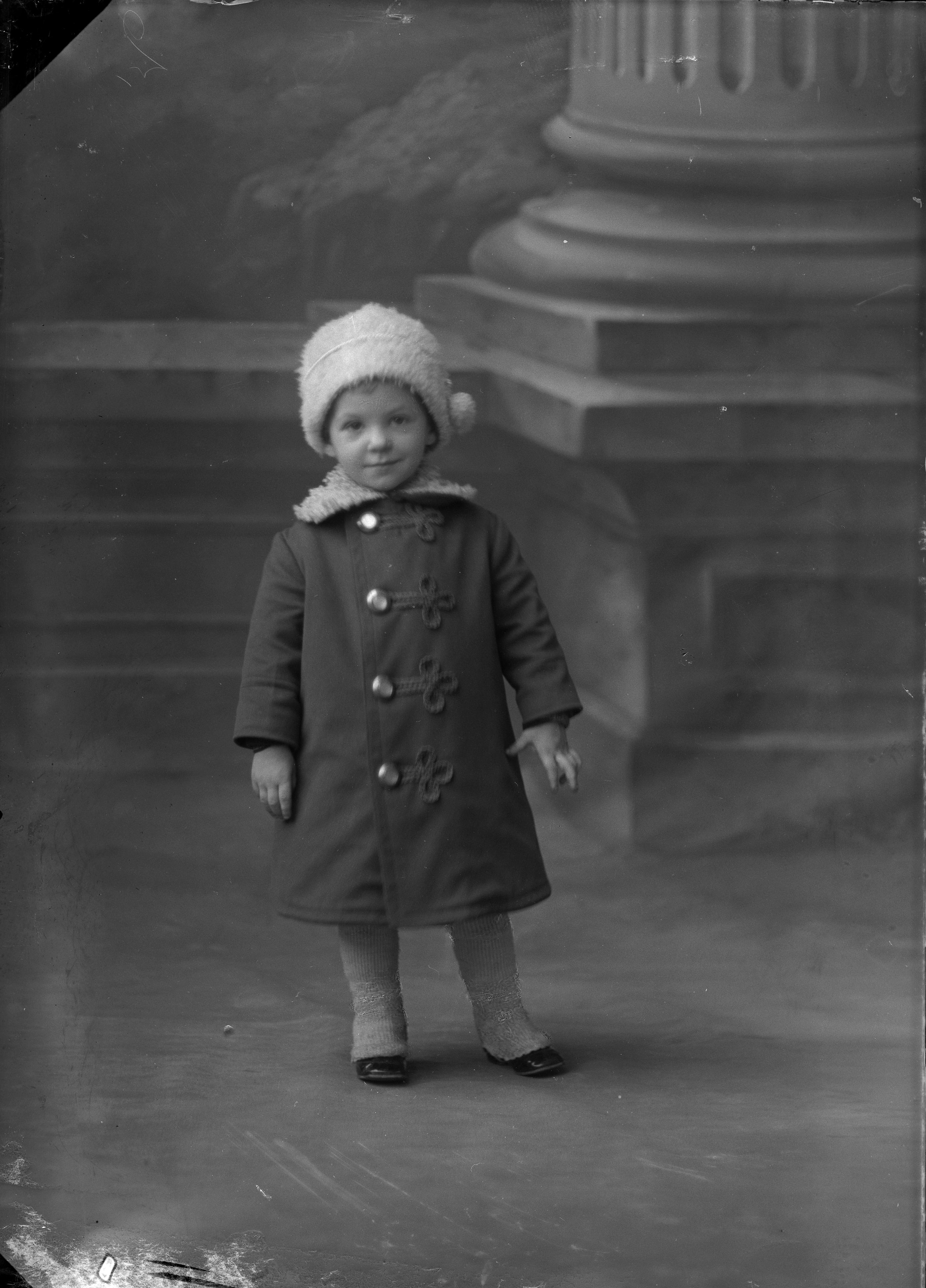 Porträtt i helfigur av Kämpes barn i ytterkläder. Ateljéfond med pelarmotiv utgör bakgrunden.