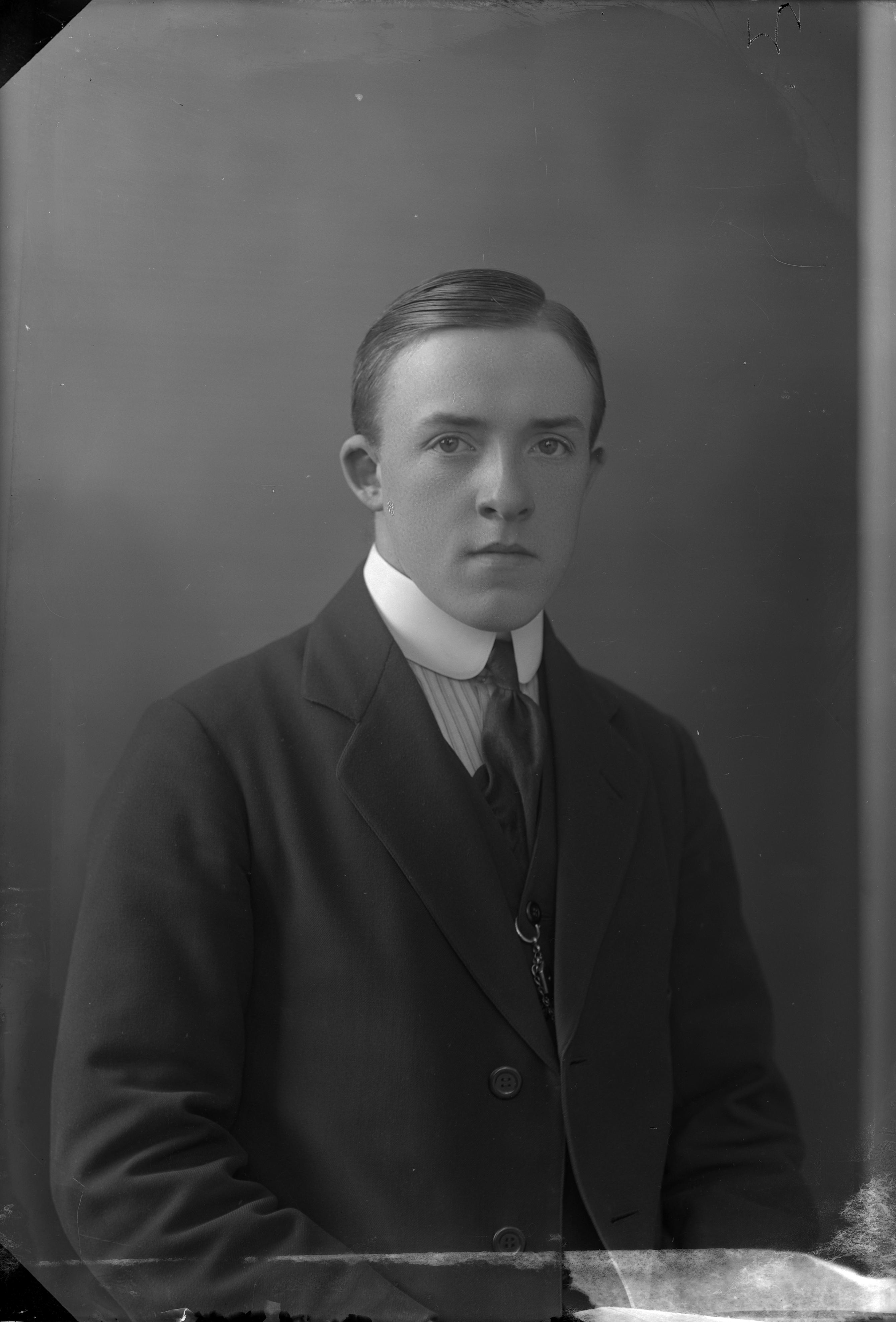 Beskrivning: Porträtt i halvfigur av Gösta Sjöström.