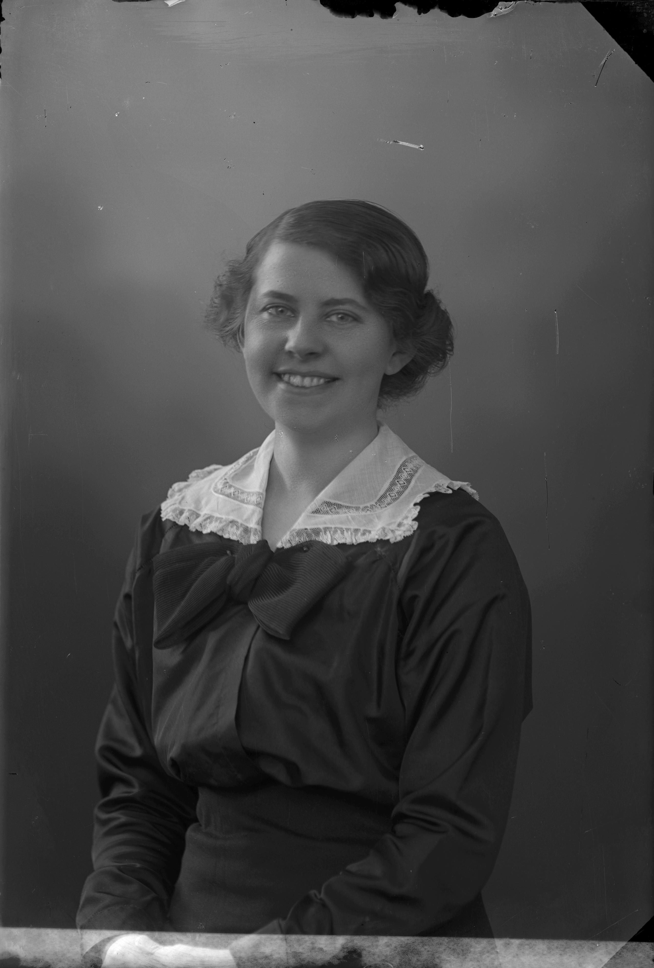 Beskrivning: Porträtt i halvfigur av Nelly Appelqvist.
