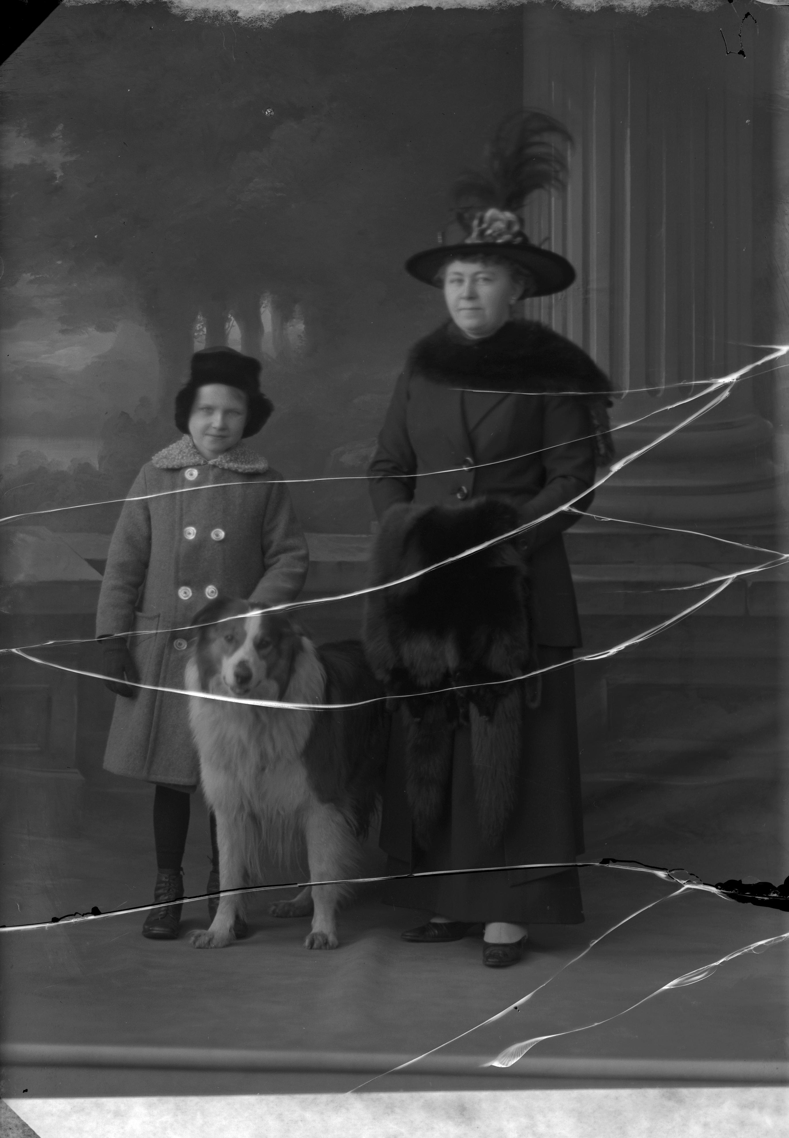 Porträtt i helfigur av fru Brand med sitt barn. Hon i hatt och kappa, barnet i mössa och ytterkläder. Ateljéfond med pelarmotiv och parkmiljö utgör bakgrunden.