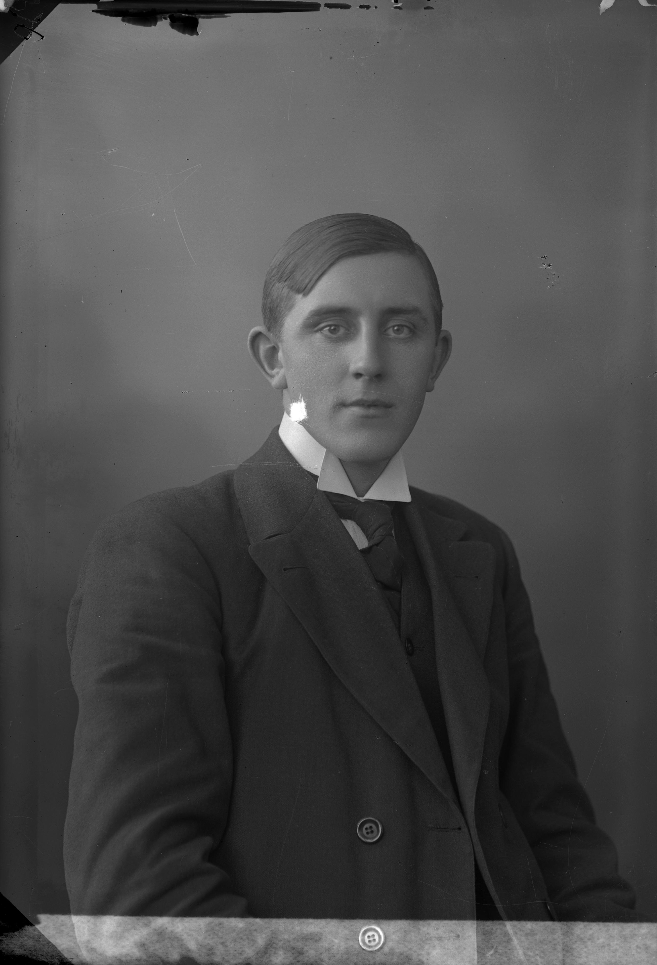 Beskrivning: Porträtt i halvfigur av Uno Claesson.