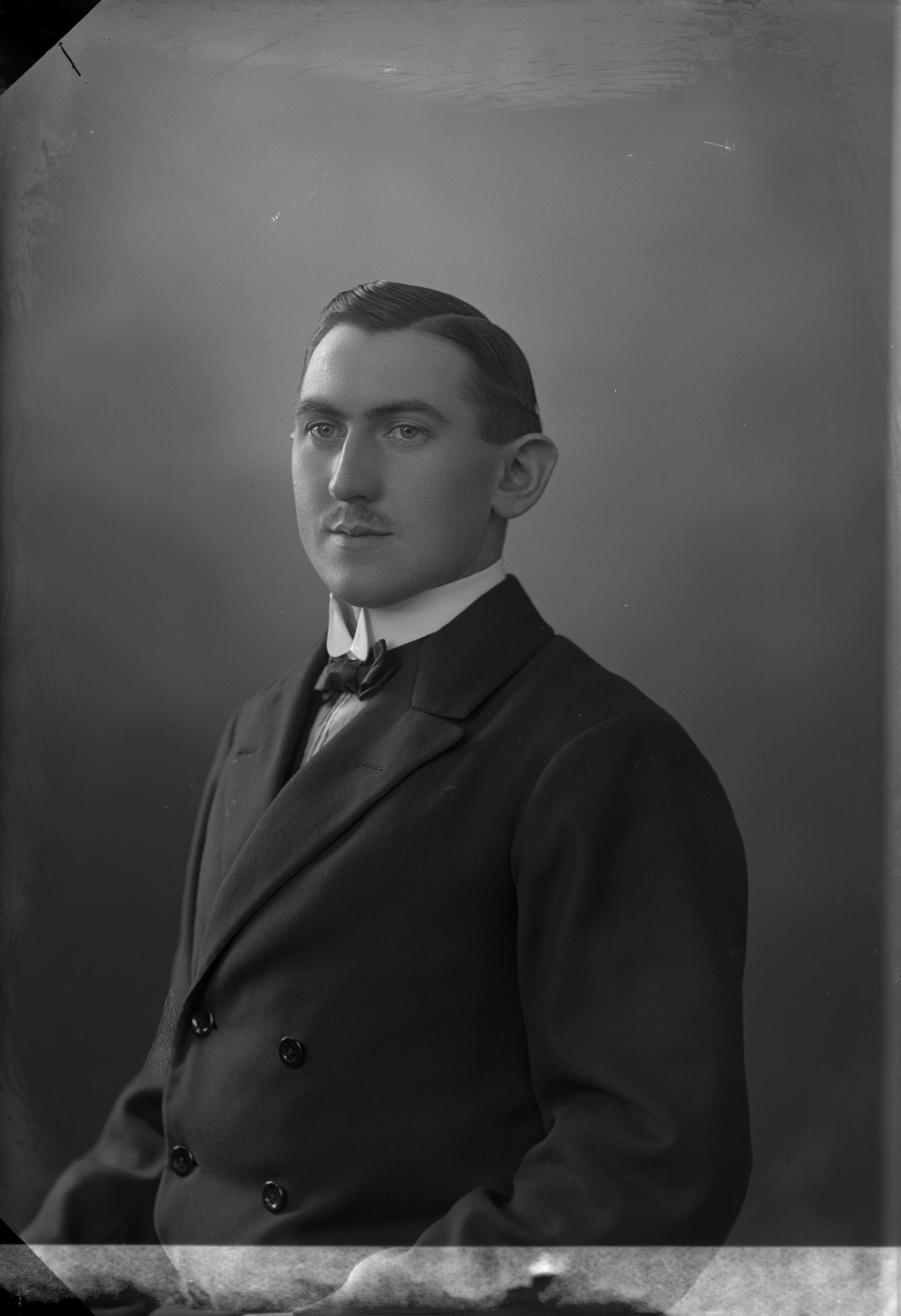 Beskrivning: Porträtt i halvfigur av Arvid Dahlin.