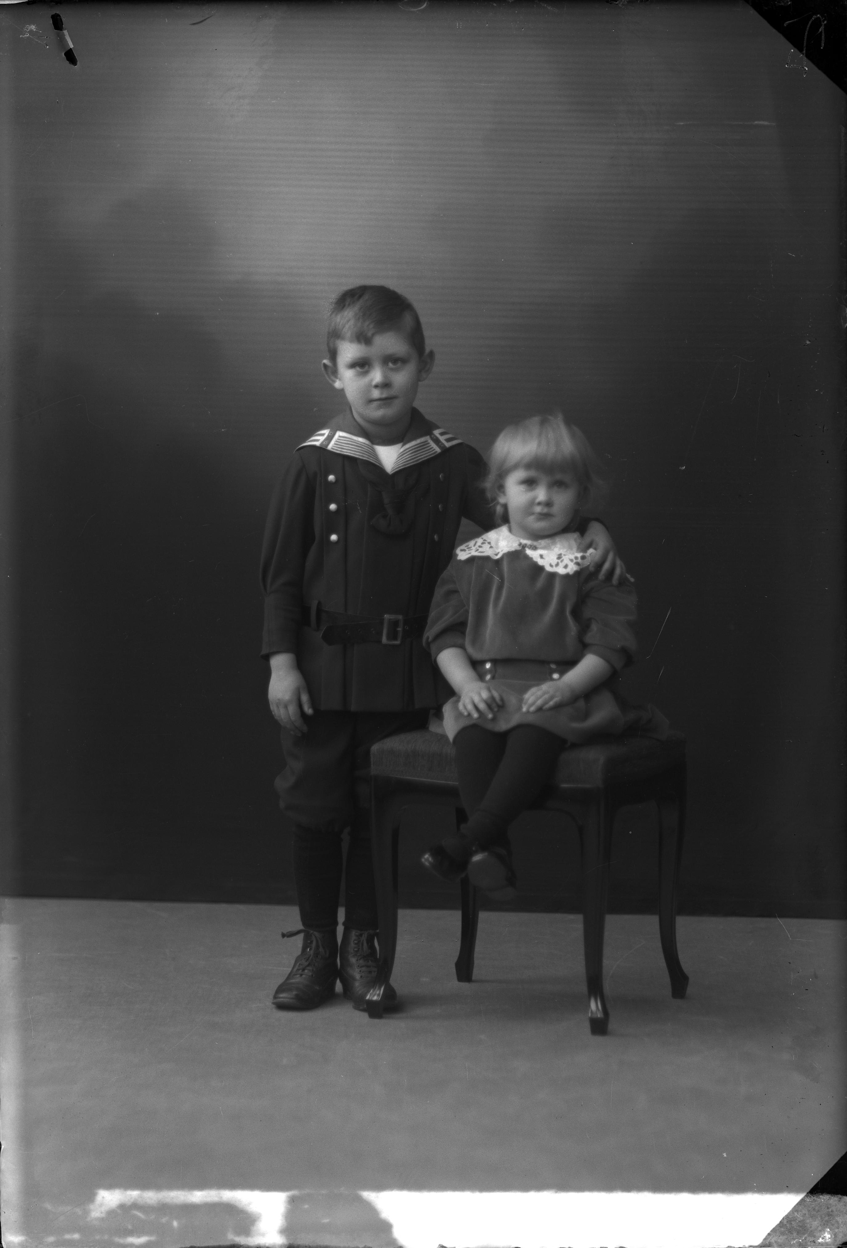 Porträtt i helfigur av Hertzels barn, det yngsta sittande på taburett.