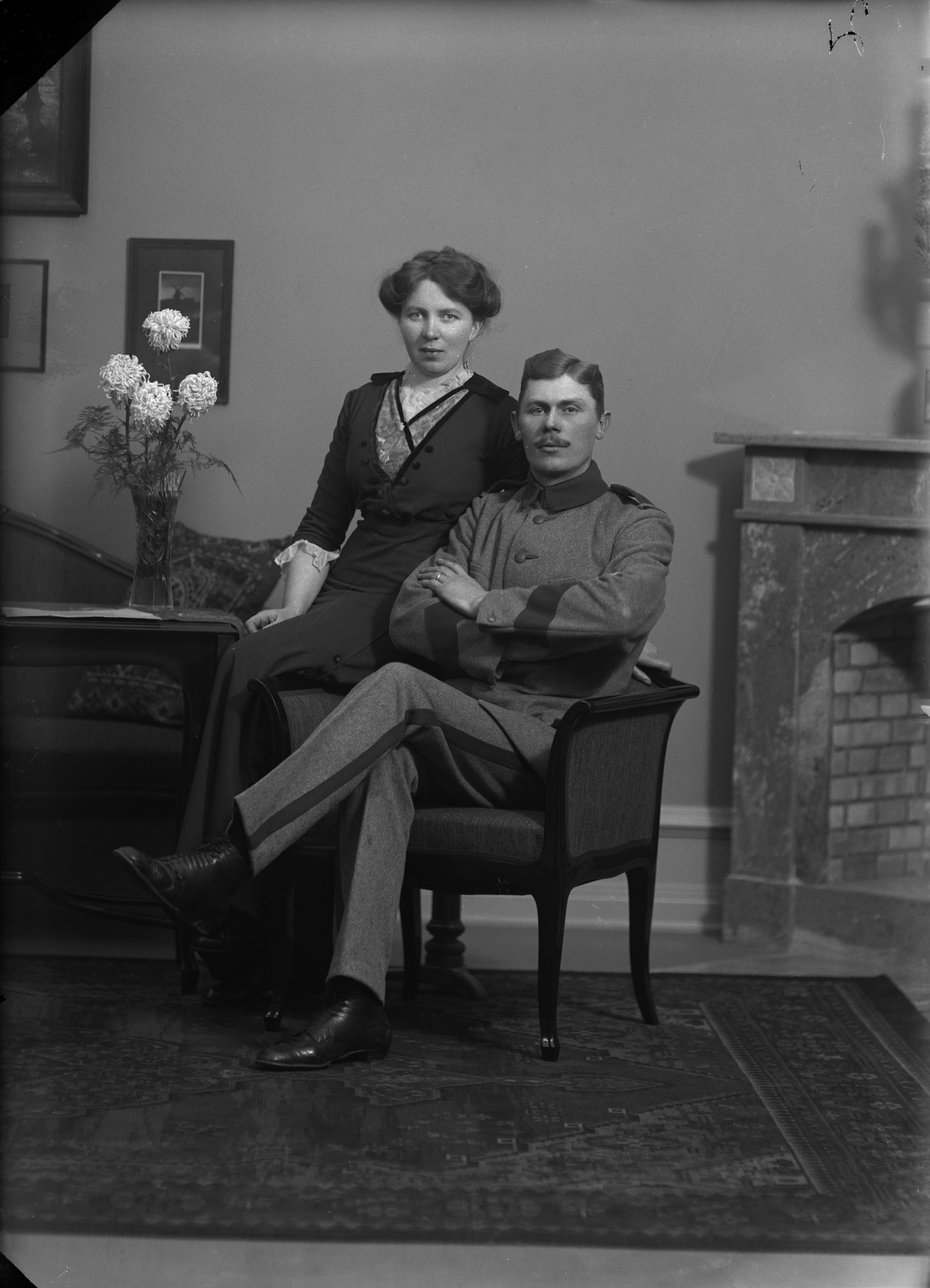 Porträtt i helfigur av Jöns Nilsson i militäruniform, sittande i stol. Frun sittande på armstödet.