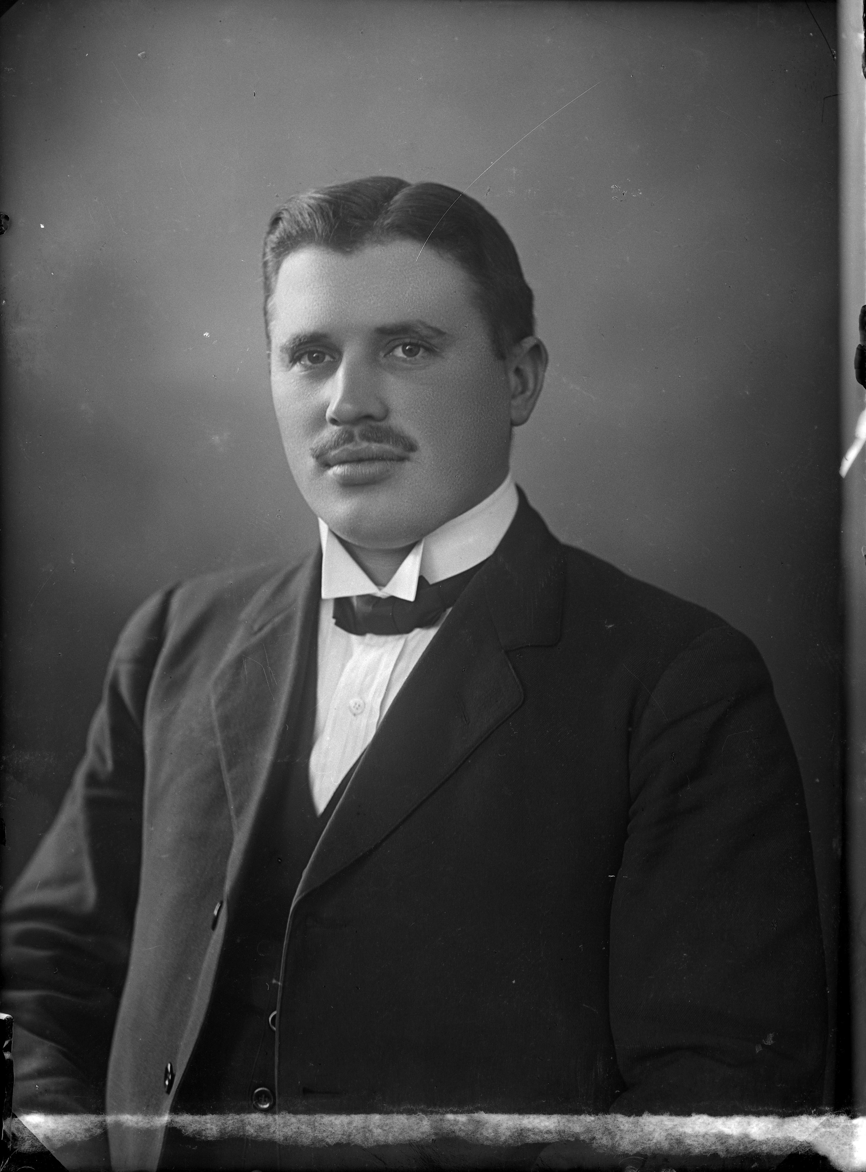 Beskrivning: Porträtt i halvfigur av postexpeditör Dahlén.