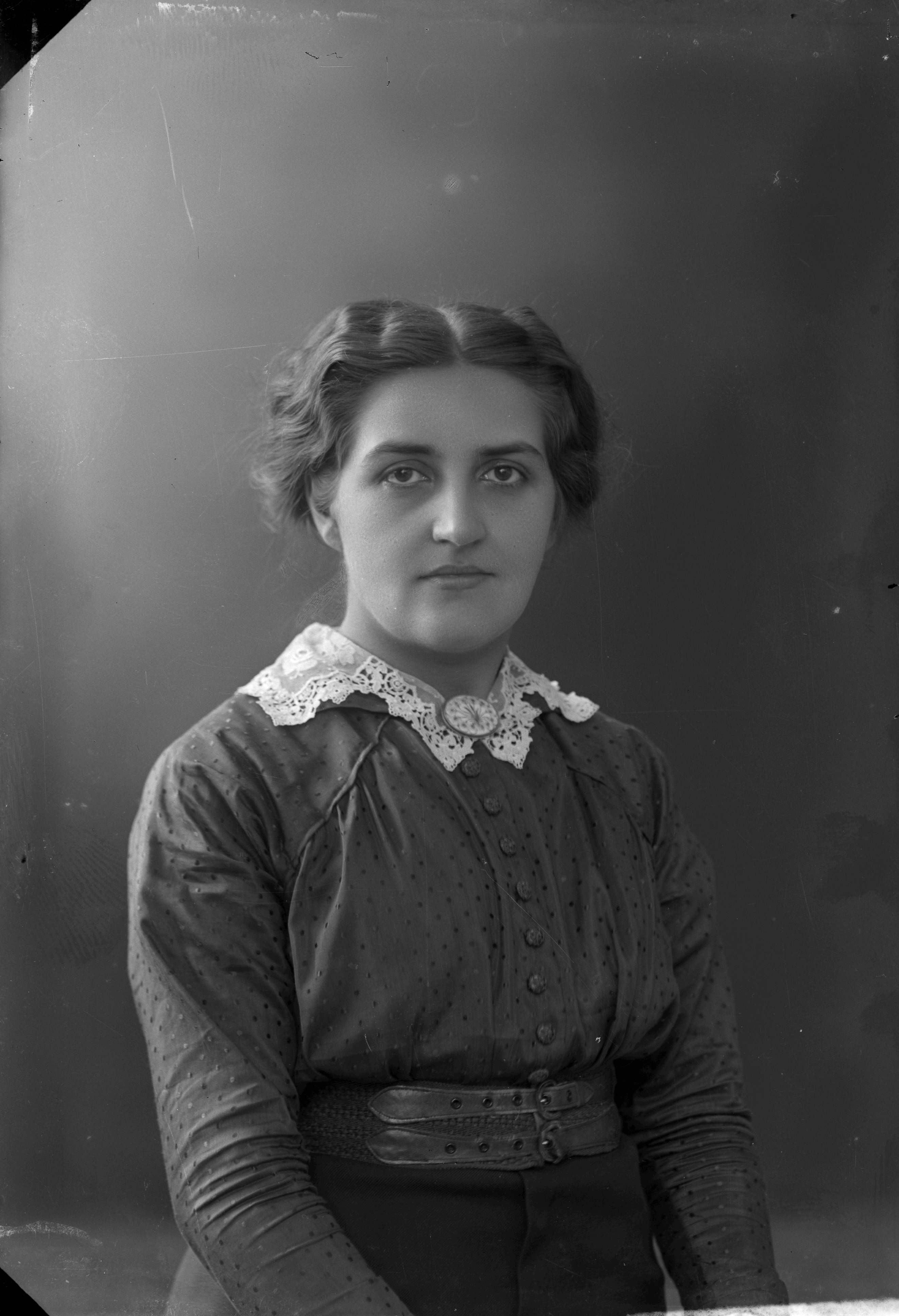 Beskrivning: Porträtt i halvfigur av Valborg Jönsson.