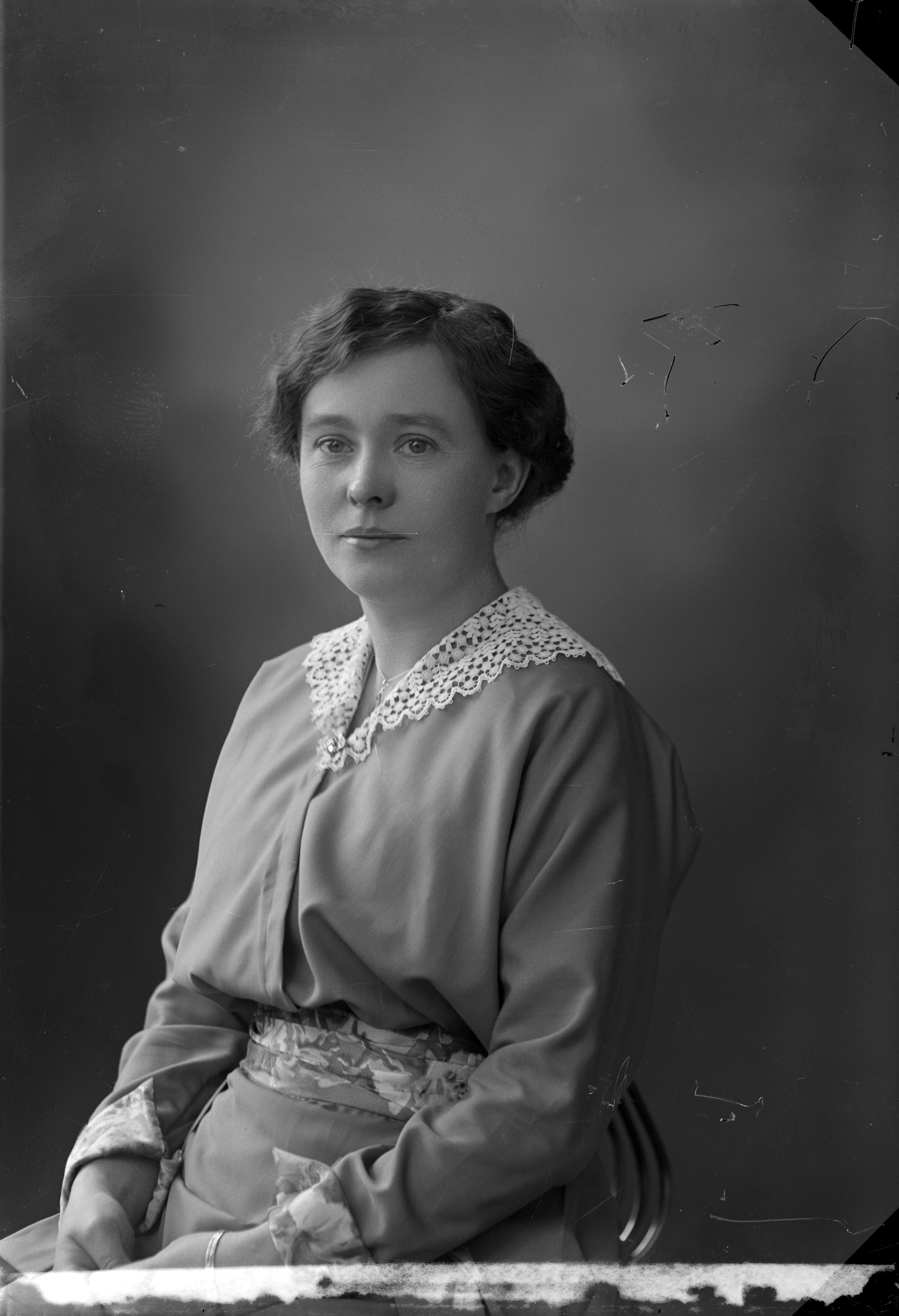 Beskrivning: Porträtt i halvfigur av folkskollärarinnan Anna Ahnborg.
