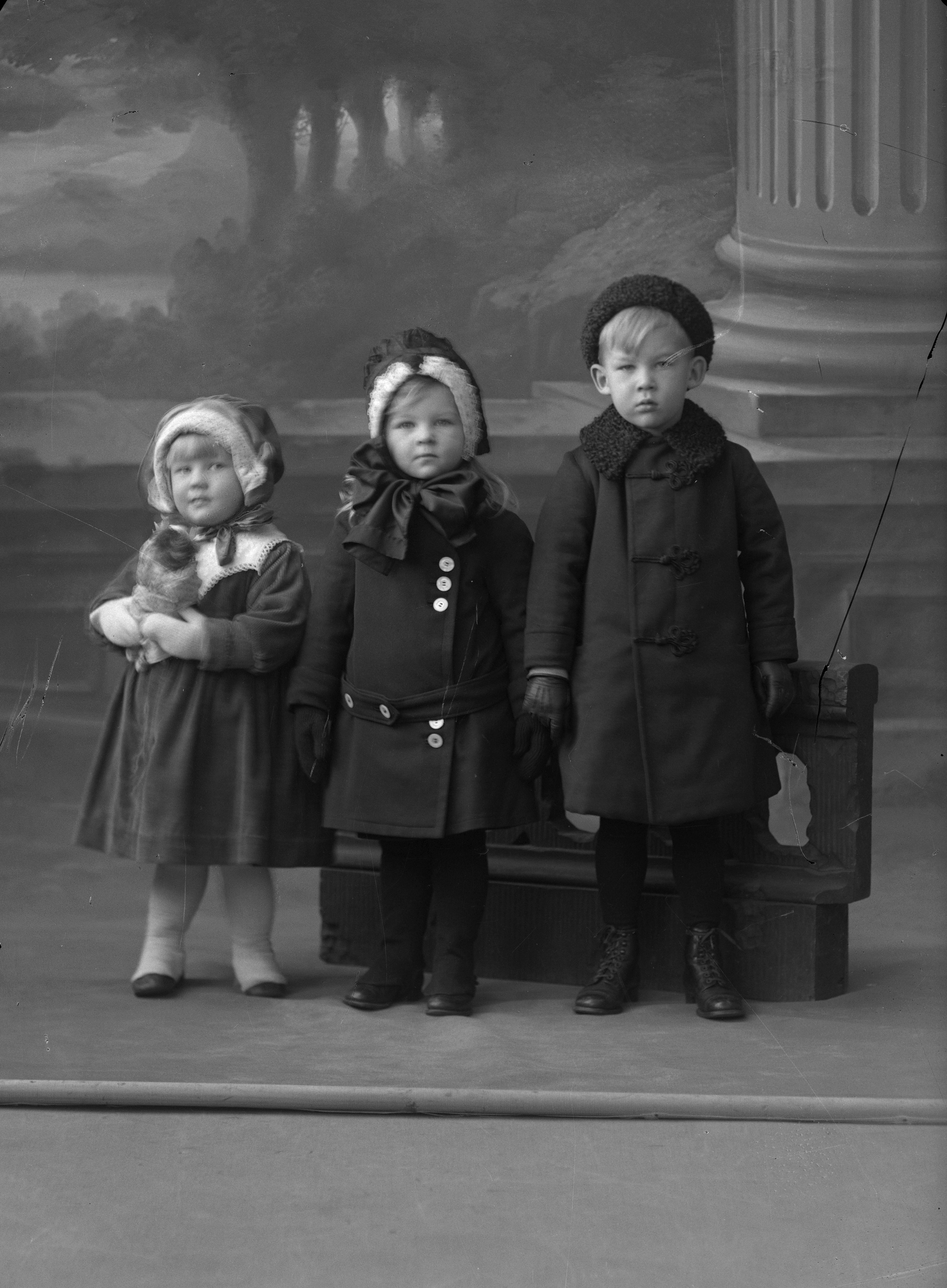Porträtt i helfigur av tandläkare Köhlers barn, iklädda ytterkläder, sonen i mössa, döttrarna i hättor, stående vid stenstaket med balustrad. Ateljéfond med pelarmotiv utgör bakgrunden.