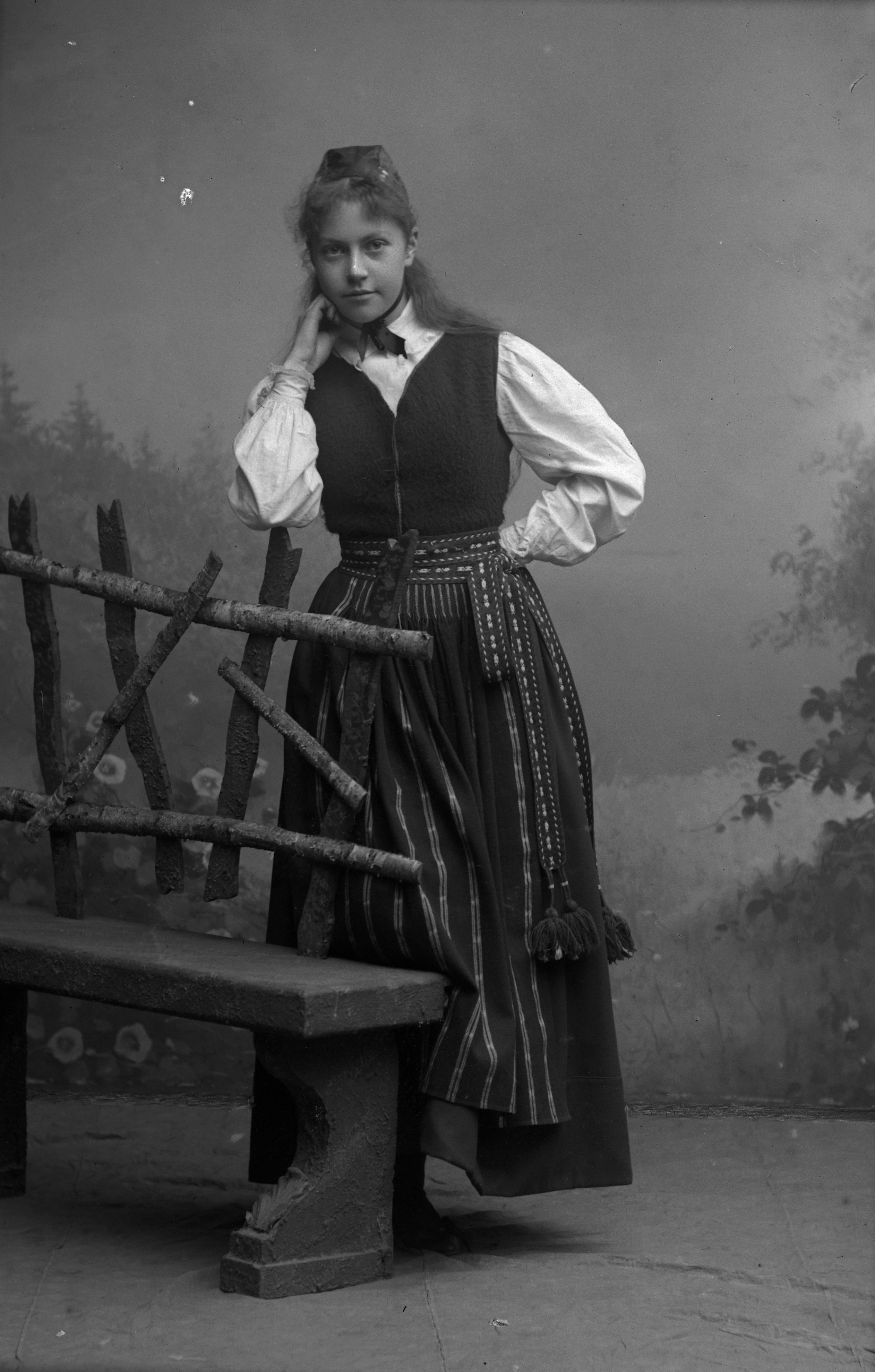Porträtt i helfigur av fröken Holmberg iklädd folkdräkt, stående vid stenbänk men ryggstöd gjord av trädgrenar. Ateljéfond med skogsmotiv utgär bakgrunden.