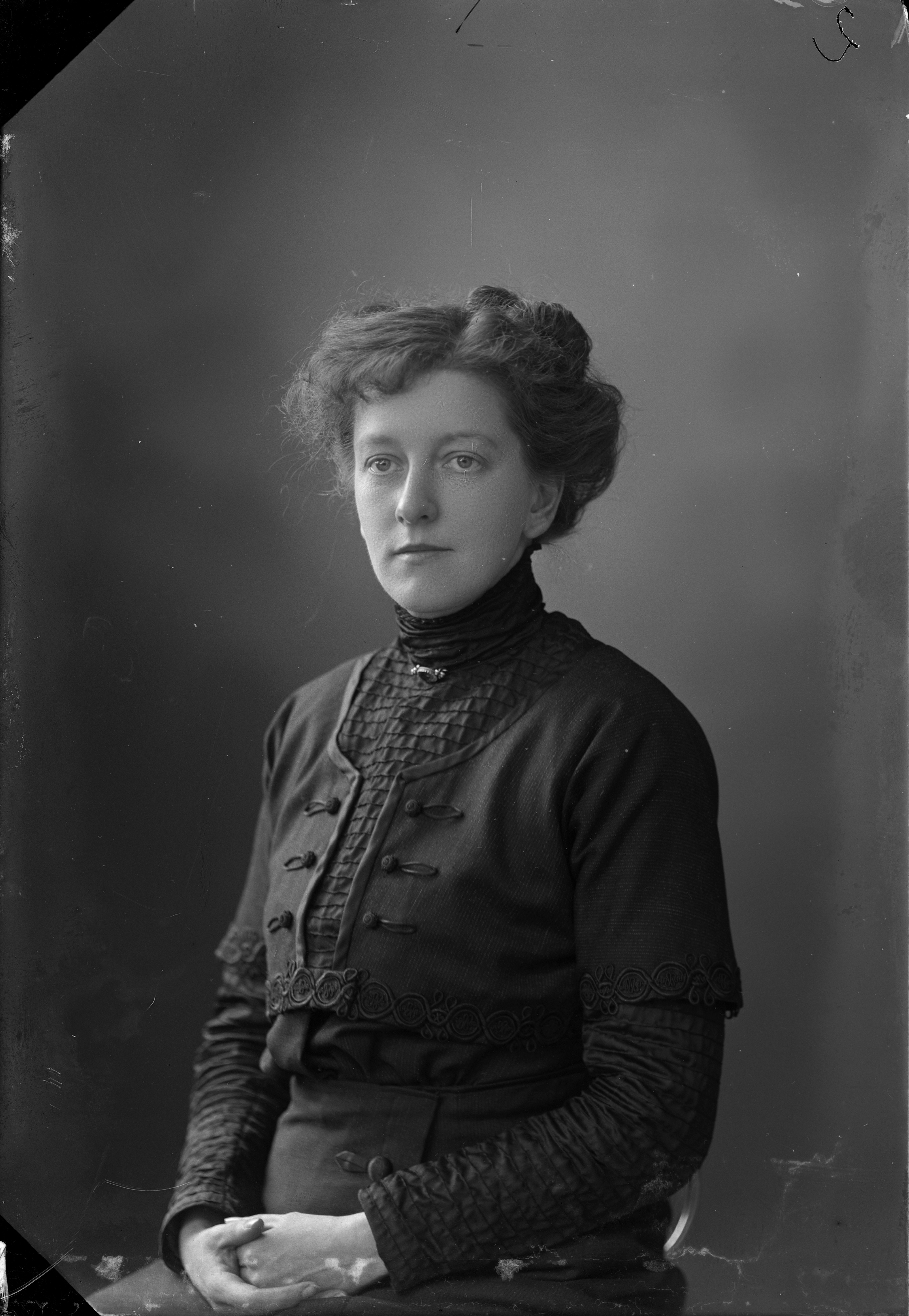 Beskrivning: Porträtt i halvfigur av Thyra Berglund.