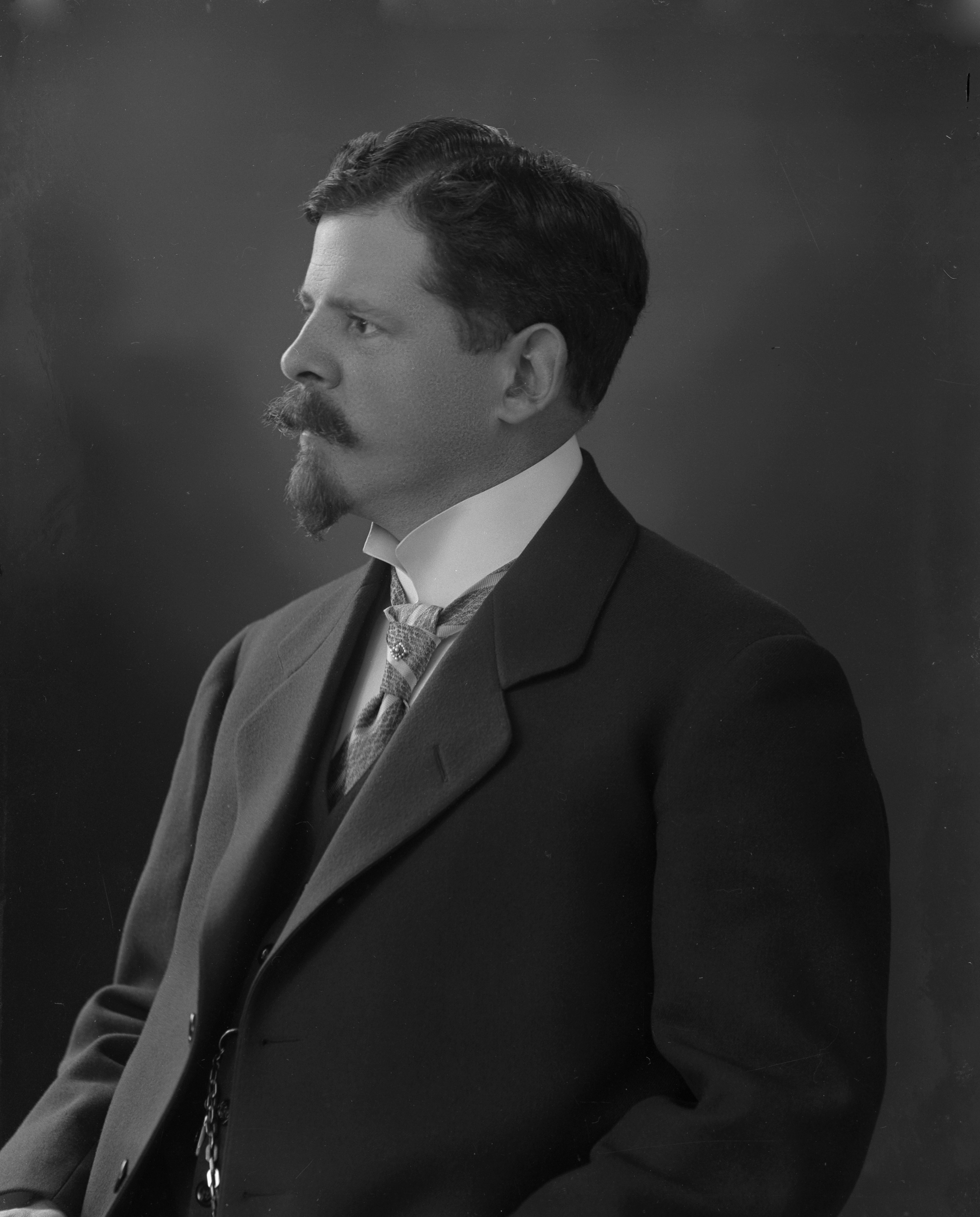 Porträtt i halvfigur, profil, av B. Fehrman.
