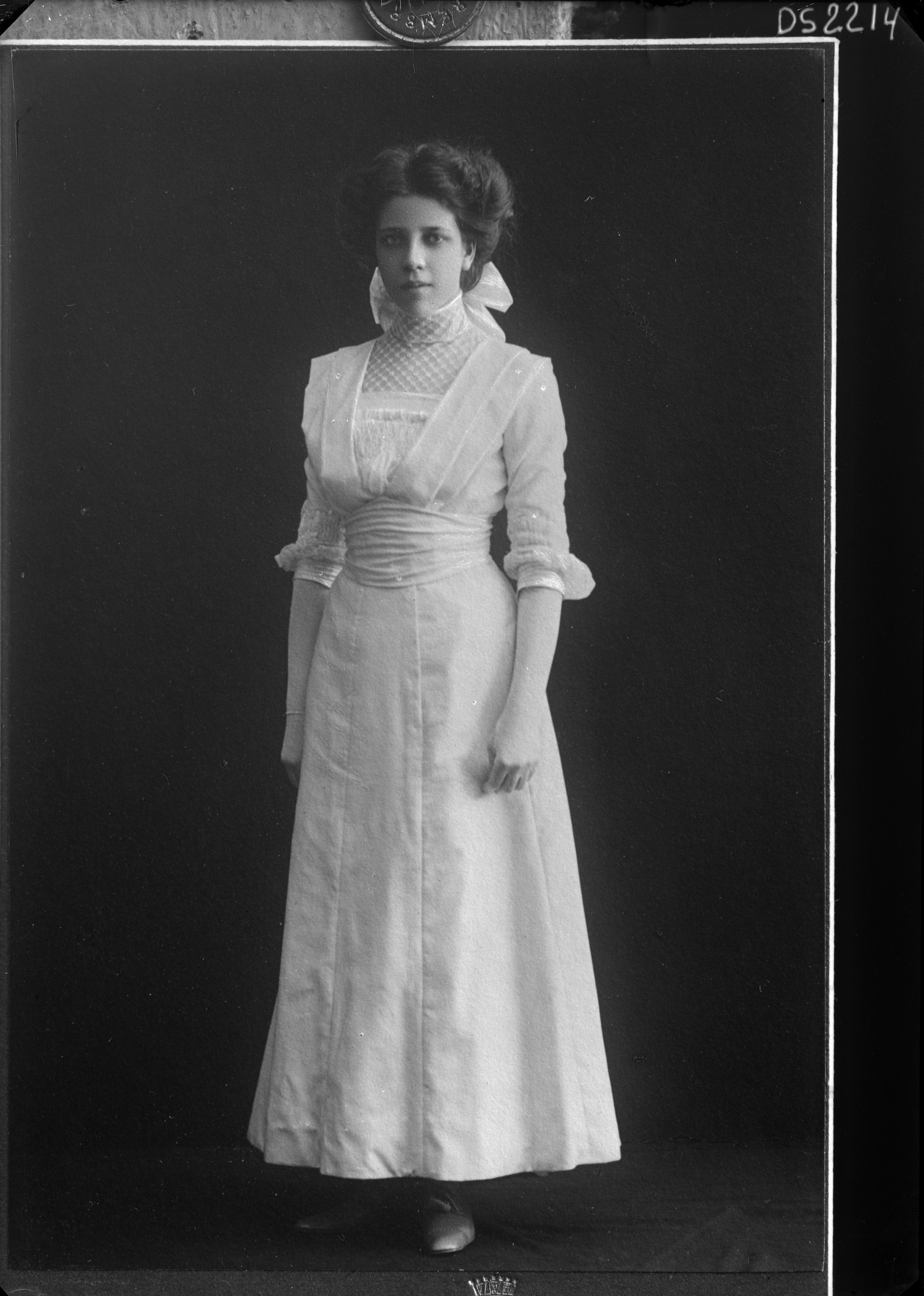 Beskrivning: Porträtt i helfigur av fröken Happach.