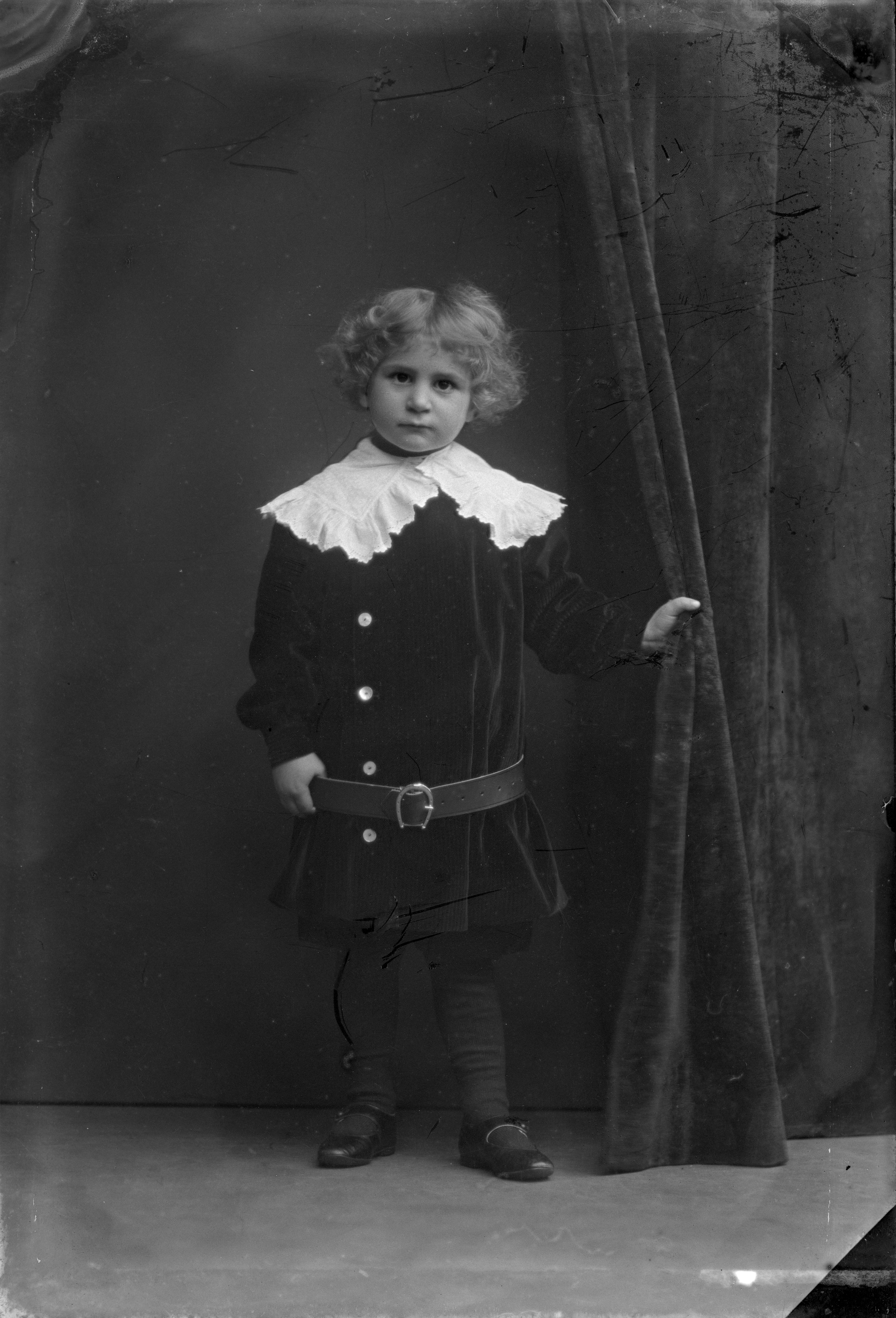 Porträtt i helfigur av oidentifierad pojke, stående vid draperi.