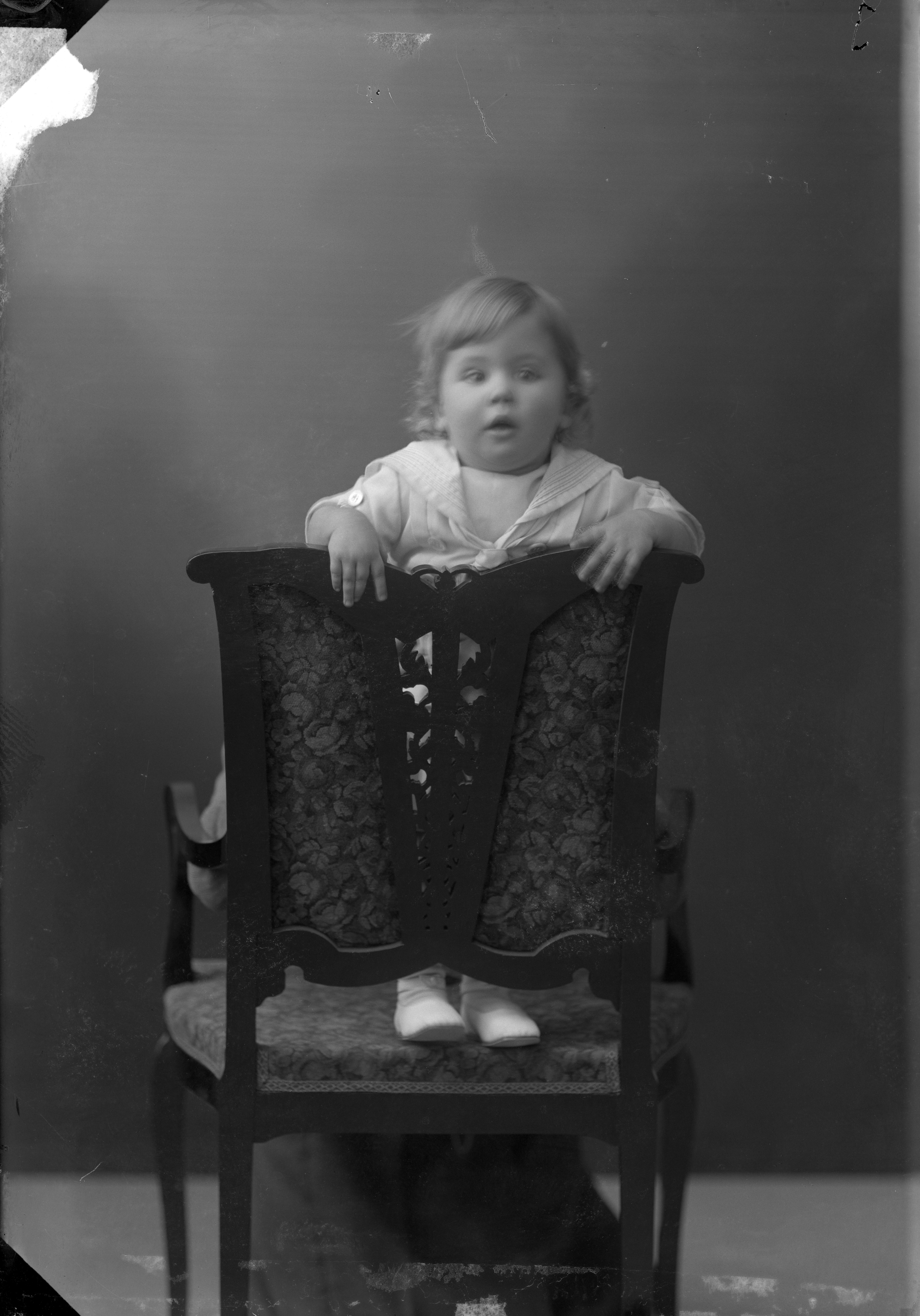 Beskrivning: Porträtt i helfigur av fru Wohlgasts barn stående på stol.