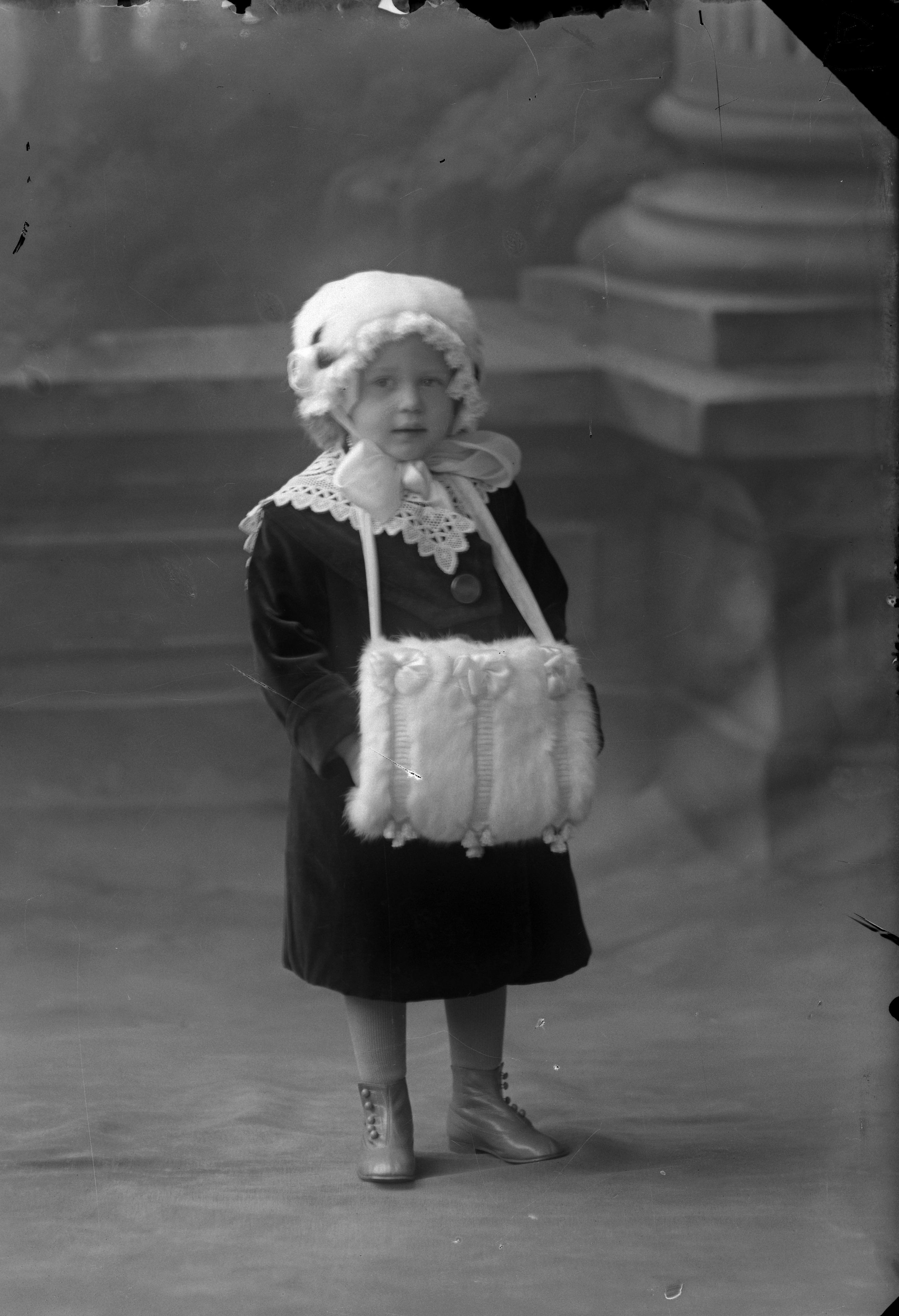 Porträtt i helfigur av Johan L. Larssons dotter kllädd i mössa, hållande handmuff. Ateljéfond med pelarmotiv utgör bakgrunden.