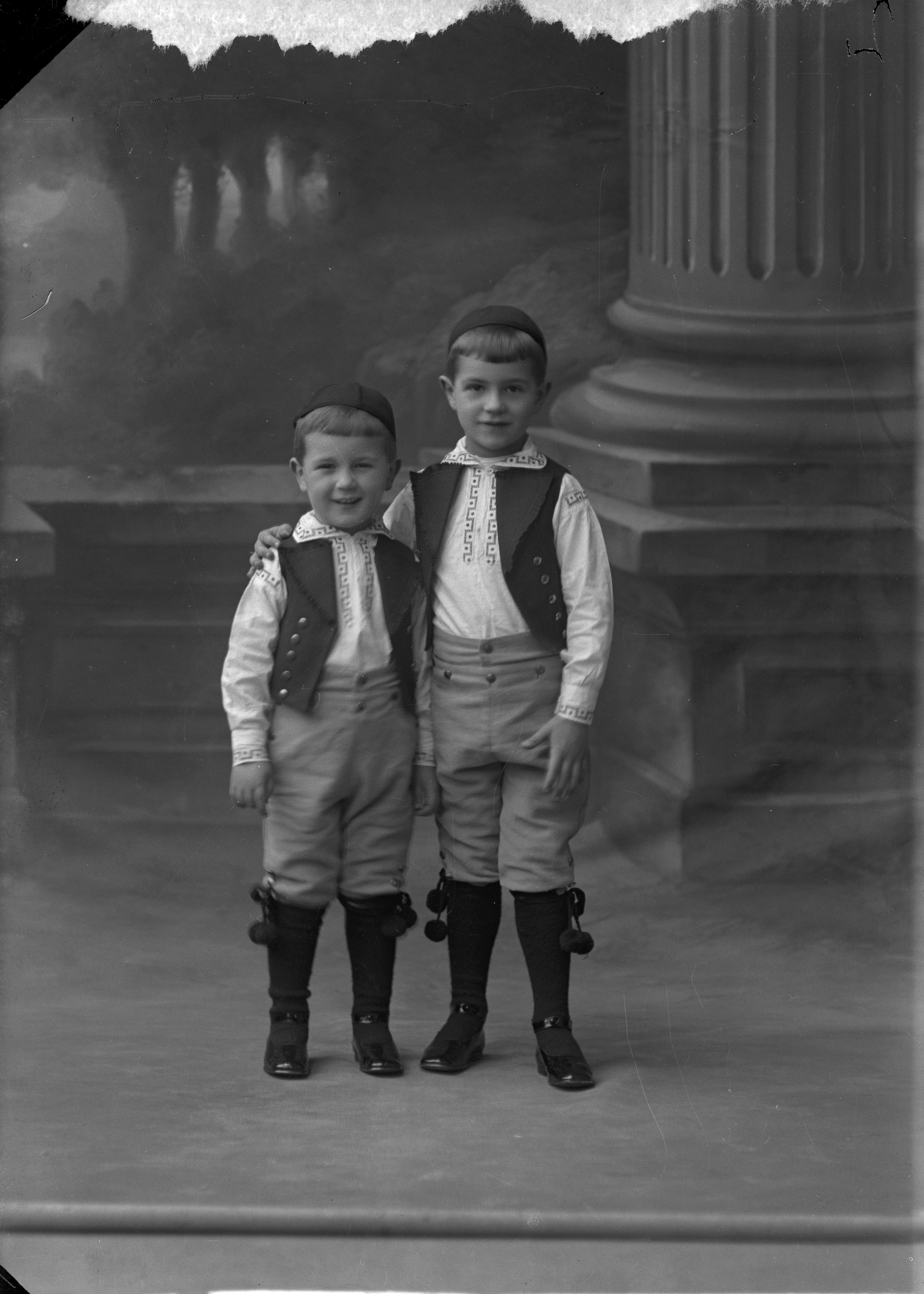 Porträtt i helfigur av ingejör Sjöbergs söner, iklädda mössor och västar. Ateljéfond med pelarmotiv och parkmiljö utgör bakgrunden.